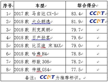人民網(wǎng)北京3月19日電(吳曉琴)3月18日,中國汽車消費者研究及測試中心(以下簡稱CCRT)2019年度第一批車型評價結果發(fā)布會在天津召開。本批次評價涵蓋了緊湊型轎車、小型SUV、緊湊型SUV、MPV四類汽車的8款熱門車型,從整體結果看,綜合得分80分及以上車型共計2款,成為CCRT2019年度推薦車型,80分以下車型共計6款。各車型具體得分如下: