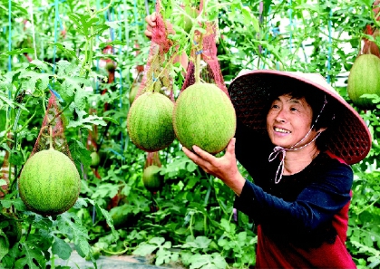柯坦蒲崗扶貧產(chǎn)業(yè)園由村成立合作社統(tǒng)一管理,吸納9個經(jīng)營主體,采用“合作、租賃、切塊”三種經(jīng)營模式帶動162戶貧困戶脫貧致富。目前,79個單體大棚內(nèi)分別種滿了西瓜、草莓、土豆、甜瓜、油麥菜等20多個品種的瓜果蔬菜。圖為貧困戶江守愛在扶貧產(chǎn)業(yè)園里務(wù)工。 周躍東 攝