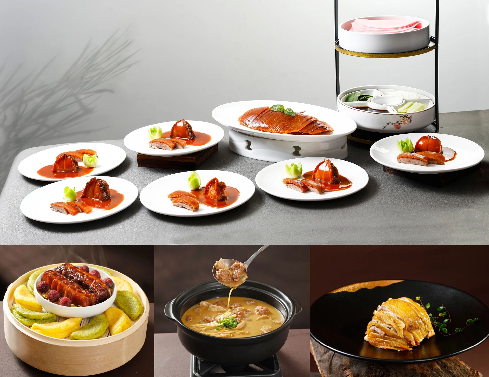 汴京鮑魚烤鴨是宋風(fēng)雅宴的招牌菜品,《東京夢華錄》中記載的『汴京烤鴨』與宋時名貴食材鮑魚結(jié)合,精選上等填鴨,歷經(jīng)3次選美,預(yù)冷排酸8小時,以新鄭棗木烤制90分鐘,出爐烤鴨周身?xiàng)椉t,色澤誘人,脂香濃烈,再配以秘汁燒制的鮑魚食用,重現(xiàn)宋時汴京風(fēng)華。