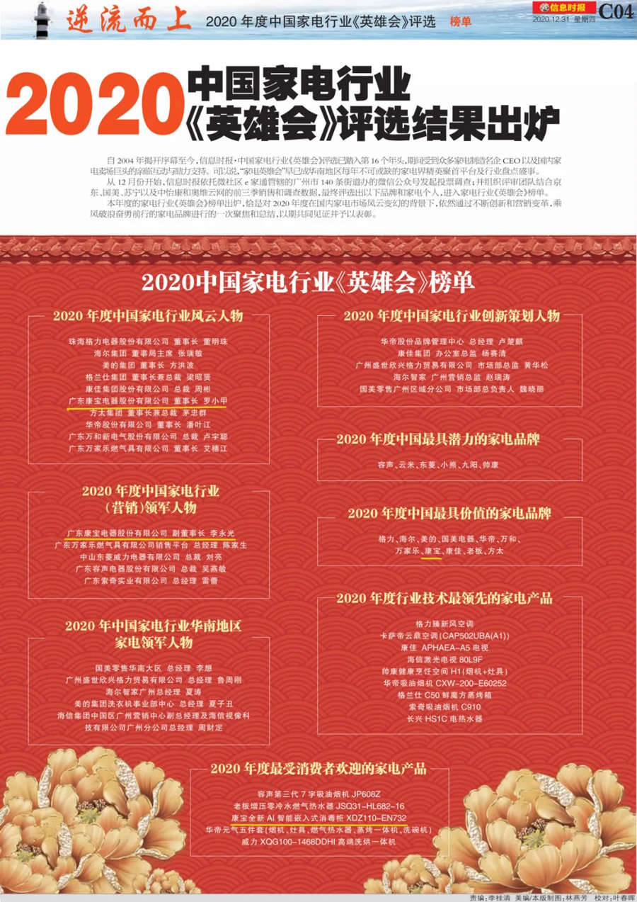 據(jù)悉,由信息時(shí)報(bào)社策劃并主辦的“中國(guó)家電英雄會(huì)”旨在打造家電行業(yè)交流與聯(lián)誼平臺(tái),并誠(chéng)意褒揚(yáng)為中國(guó)家電發(fā)展做出積極貢獻(xiàn)的家電群英?;顒?dòng)自2004年開(kāi)始至今,已成功舉辦了十六屆?!爸袊?guó)家電英雄會(huì)”已成華南地區(qū)每年不可或缺的家電界精英聚首及行業(yè)盤點(diǎn)盛事。本屆英雄會(huì)評(píng)選歷經(jīng)40多天的投票、篩選及專家團(tuán)評(píng)審,并結(jié)合京東、國(guó)美、蘇寧以及中怡康和奧維云網(wǎng)等前三季的銷售和調(diào)查數(shù)據(jù),最終選出2020年度中國(guó)家電行業(yè)英雄會(huì)獲獎(jiǎng)名單。 2020年,康寶在羅小甲董事長(zhǎng)的正確領(lǐng)導(dǎo)下,在副董事長(zhǎng)兼常務(wù)副總裁李永光的精心統(tǒng)籌和科學(xué)部署下,康寶在銷售增長(zhǎng)、品牌提升、技術(shù)創(chuàng)新、產(chǎn)品研發(fā)、品質(zhì)改善、生產(chǎn)效率提升、售后服務(wù)優(yōu)化等方面都取得了喜人成績(jī),康寶的發(fā)展贏得了政府及社會(huì)各界的肯定與好評(píng)。 品牌見(jiàn)證實(shí)力,榮譽(yù)彰顯輝煌。已走過(guò)32年歷程的康寶立志打造百年企業(yè)。展望2021年,康寶人將不忘初心、砥礪前行、精益求精,為消費(fèi)者研發(fā)更多更好的健康電器而不懈努力!