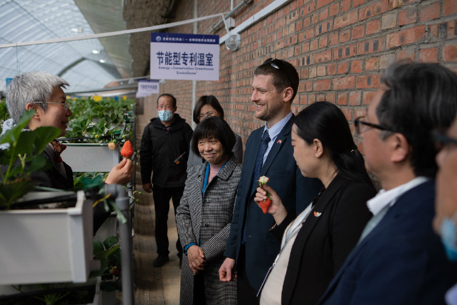 與會代表觀摩示范園并品嘗園區(qū)草莓和番茄 以色列大使館公使銜商務(wù)參贊艾曄賓和商務(wù)主任董燕在參觀完示范園區(qū)后,對以色列現(xiàn)代農(nóng)業(yè)技術(shù)在中國大地開花結(jié)果感到十分欣慰。艾曄賓說,中國人民和以色列人民有著深遠(yuǎn)的友誼,以色列農(nóng)業(yè)技術(shù)企業(yè)將全力投身到中國鄉(xiāng)村振興這項偉大的事業(yè)中來,并堅信中以農(nóng)業(yè)合作一定會為中國鄉(xiāng)村振興作出積極的貢獻(xiàn)。 據(jù)了解,以色列艾森貝克公司2016年1月正式加入金正大集團(tuán)。艾森貝克的加入,不僅加快了金正大國際化發(fā)展的步伐,也為集團(tuán)在現(xiàn)代設(shè)施農(nóng)業(yè)領(lǐng)域發(fā)力奠定了基礎(chǔ)。 3月24號下午的論壇由以色列駐華大使館商務(wù)處商務(wù)主任董燕女士主持,以色列駐華大使館公使銜商務(wù)參贊艾曄賓、中國農(nóng)業(yè)科技園區(qū)規(guī)劃專家、中國農(nóng)業(yè)科學(xué)院客座教授張成波、山東省農(nóng)業(yè)廳國際合作處二級調(diào)研員宋蓮萍、國際肥料學(xué)會執(zhí)行董事、金正大集團(tuán)副總裁翟際棟、中國國際衛(wèi)視中文臺臺長湯世珺參加了“2021以色列現(xiàn)代農(nóng)業(yè)技術(shù)應(yīng)用與推廣論壇”, 論壇嘉賓就中以農(nóng)業(yè)科技合作,賦能鄉(xiāng)村產(chǎn)業(yè)振興這個主題進(jìn)行了討論及深入交流,將在鄉(xiāng)村振興、農(nóng)業(yè)綠色發(fā)展、農(nóng)業(yè)科技研發(fā)和成果轉(zhuǎn)化、新媒體參與農(nóng)業(yè)品牌推廣等領(lǐng)域加強(qiáng)合作。