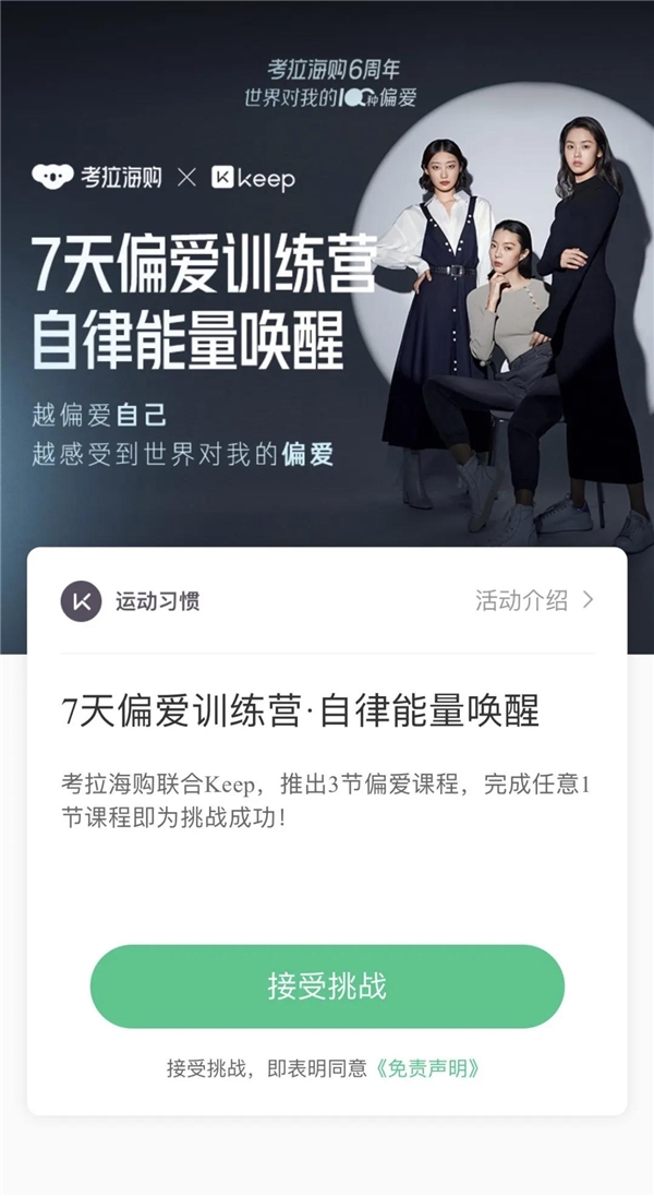 世界奇妙盒 趣味互動配上暖心文案,考拉海購讓花錢這件事告別盲目跟風(fēng),而是從價值認(rèn)同開始,到自我滿足結(jié)束。借助時尚感、儀式感傳遞出品牌的悅己理念,喚起消費(fèi)者對品牌和平臺的好感。 正因?yàn)槎脨偧号缘膬?nèi)心,才知道購物不是她們的全部,身材管理同樣重要。本次營銷中,考拉海購還聯(lián)合Keep持續(xù)打造“偏愛行動”,推出考拉海購用戶聯(lián)名定制課程?;趦?nèi)容的聯(lián)動,把用戶圈層從電商領(lǐng)域跨界到健身人群,實(shí)現(xiàn)在新用戶面前的打卡簽到。