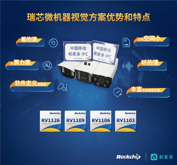 圖 | 和家親智能終端一體機及功能演示 基于RK3566芯片內(nèi)置高算力NPU及瑞芯微自研的ISP視覺算法技術(shù),和家親一體機可實現(xiàn)豐富的特色功能,如:支持智慧視覺算法,可實現(xiàn)智能安全防護監(jiān)測,遠程對家中動態(tài)和異常情況及時了解;支持語音交互,能更好解決老人孩童看電視難通話難的問題;瑞芯微自研的降噪算法可智能識別108種環(huán)境噪音,提升高清視頻通話體驗,更好實現(xiàn)居家遠程會議,讓協(xié)同辦公更便捷高效。 在智能IPC攝像頭、智能門鎖、可視門鈴產(chǎn)品領(lǐng)域,瑞芯微已與中國移動共同落地多款成熟產(chǎn)品,搭載瑞芯微高端智慧視覺芯片RV1126、RV1109,及主流智慧視覺芯片RV1106、RV1103。
