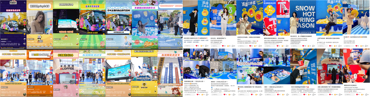 幾乎所有南方人都愛慕:“大雪彌漫,萬籟寂靜的冬日盛況”,每到冬季,都會有不少朋友準備體驗一下千里冰封、萬里雪飄的北國風情。為充分調動用戶對前往北方城市過冬的消費興趣,11月29日-12月1日,抖音生活服務「冰雪溫泉季」攜手沈陽、南京兩個城市本地頭部商圈,在沈陽中街大悅城E館、南京市內以及南京新百,聚焦溫泉洗浴特色,共同打造“沈陽花式過冬生活圈”、“南京花式過冬BUS”和“南京花式過冬生活圈”過冬互動體驗活動,吃喝玩樂四大核心區(qū)域可供打卡,南京景點巡游盡情享受,沈陽洗浴特色文化、周邊禮品免費領取,邀請大家一同解鎖花式過冬新體驗。本次沈陽、南京雙城活動的落地,全域覆蓋建立快樂過冬的氛圍感,讓快樂氛圍成為用戶的消費情緒“助燃劑”,進一步提升了活動聲量。