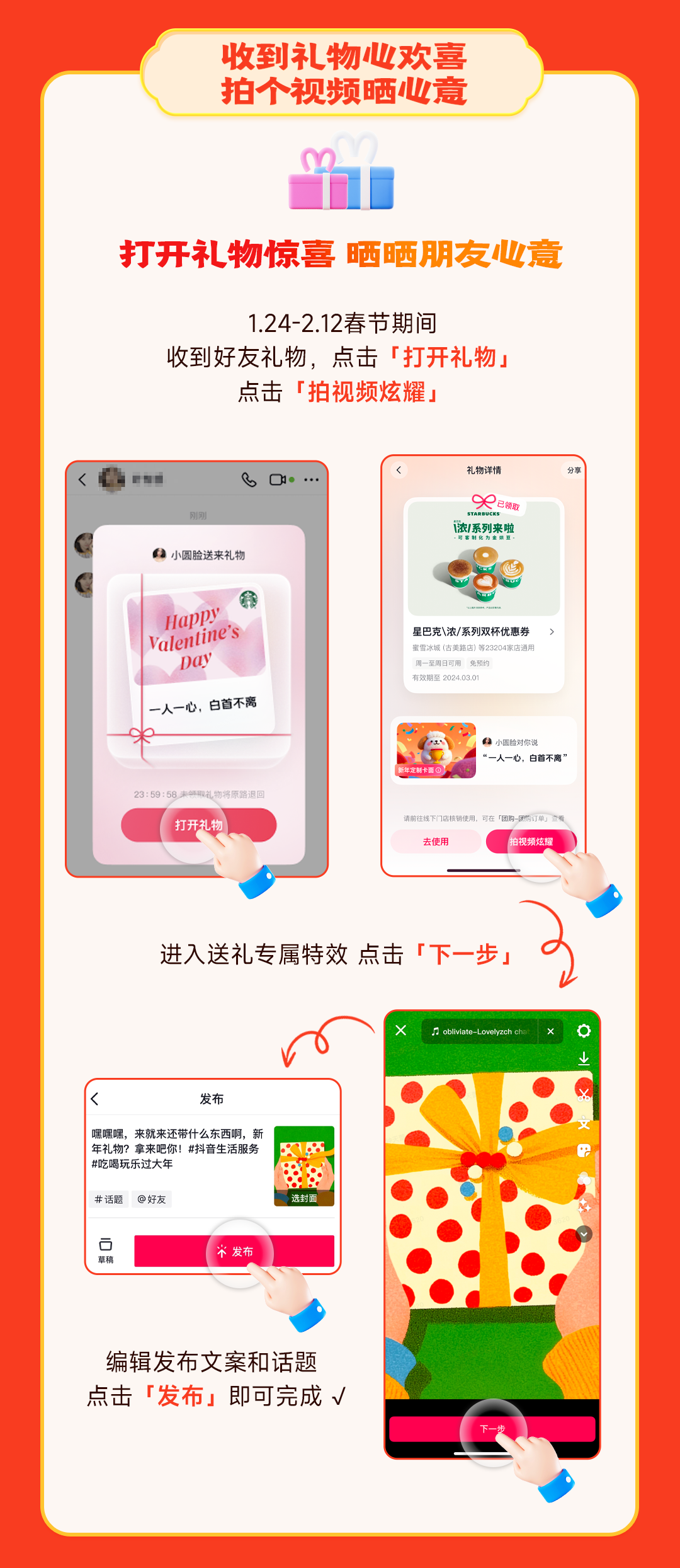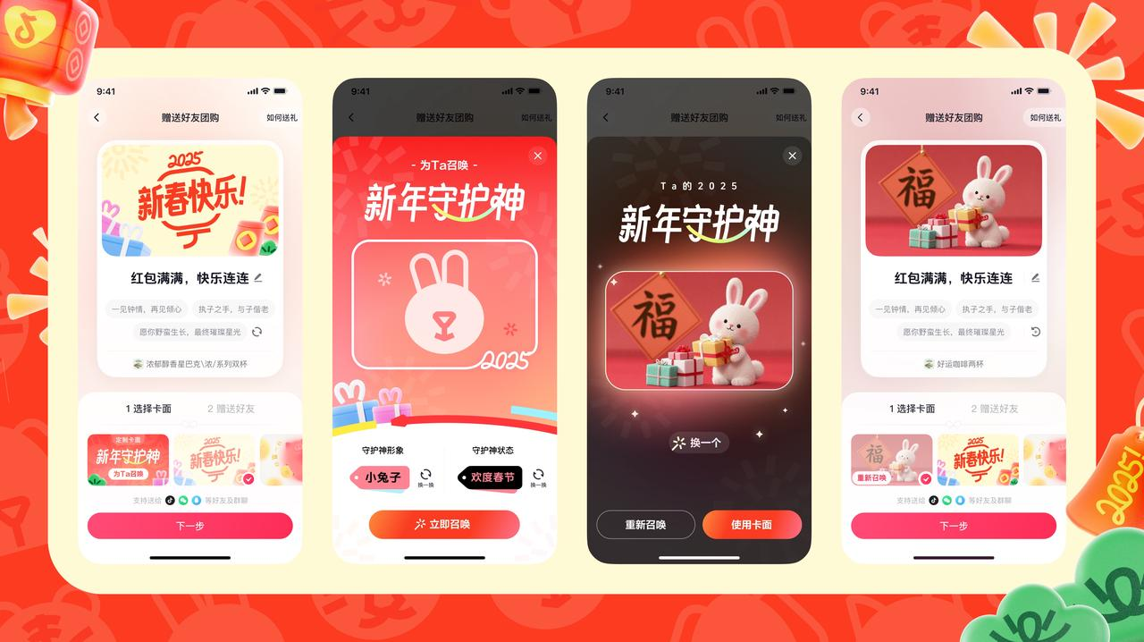 此外,抖音生活送禮玩法全面升級(jí)。1 月 24 日至 2 月 12 日期間,用戶團(tuán)購商品可一鍵 “贈(zèng)送好友”,還能附上溫馨的新年祝福語,為好友精心選擇 “新年守護(hù)神形象” 與 “守護(hù)神狀態(tài)” ,獨(dú)特新穎的送禮卡面趣味十足。收到禮物的人還能使用預(yù)制專屬特效,拍攝 “炫耀視頻”,曬出朋友的心意,讓春節(jié)的儀式感拉滿。