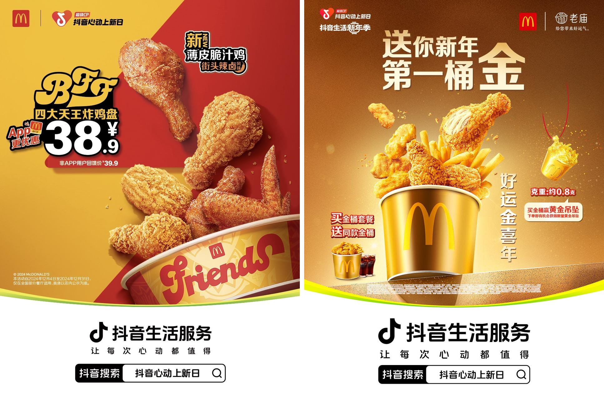 12月18日至12月25日,麥當(dāng)勞攜手熱門游戲IP“絕區(qū)零”展開跨界聯(lián)動,并在「抖音心動上新日」團(tuán)購專區(qū)特別推出了59.9元、39.9元等限定IP聯(lián)名包裝充能餐,購買套餐即可獲贈游戲精美周邊,還有高度還原游戲場景的主題門店打卡、AR實景交互體驗等創(chuàng)意玩法,邀請粉絲朋友們共赴破次元壁的快樂。12月6日至1月5日,麥當(dāng)勞與老廟黃金夢幻聯(lián)動,攜手為用戶奉上“新年第一桶金”,結(jié)合“買桶送桶”超值福利、核銷后抽獎得“周邊小金桶”和雙品牌直播連麥創(chuàng)意玩法,吸引了海量用戶關(guān)注,高效驅(qū)動品牌交易轉(zhuǎn)化。