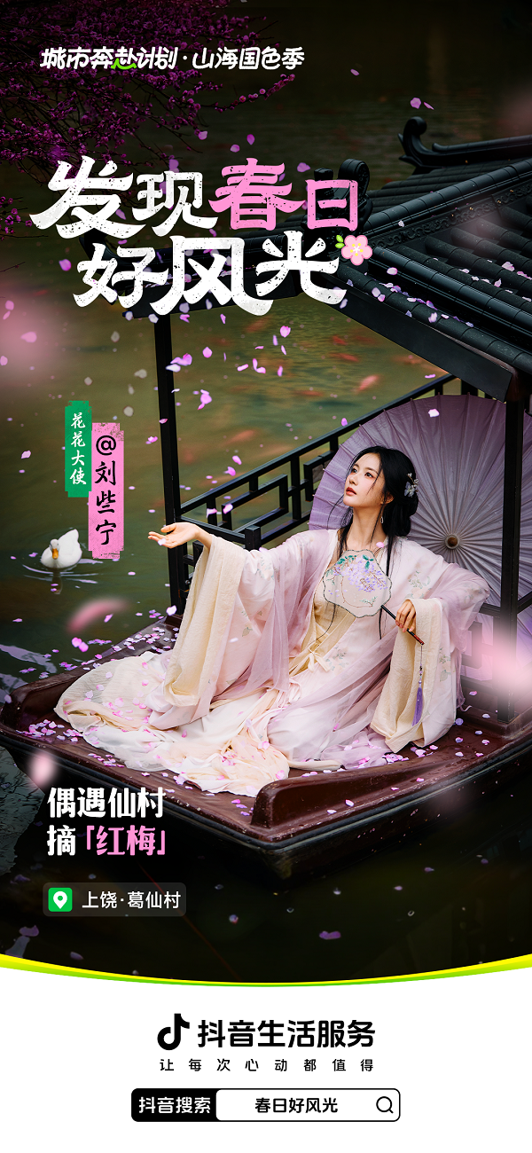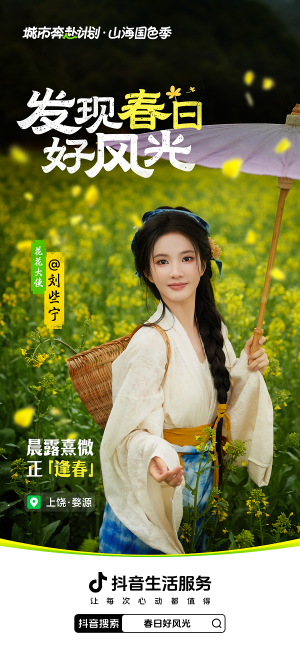 春風(fēng)拂面,新綠抽枝,當(dāng)桃李紛揚的第一片花瓣飄落肩頭,沉睡的旅行DNA便悄然蘇醒——人們迫不及待地收拾行囊,想要用鏡頭捕捉草長鶯飛的呢喃,用腳步丈量好風(fēng)光的形狀。這個春天,抖音生活服務(wù)「城市奔赴計劃·山海國色季」邀請你與@劉些寧、@余承恩兩位「花花大使」同行,讓抖音內(nèi)容創(chuàng)作與國風(fēng)美學(xué)交織成詩,解鎖最值得打卡的春日儀式感。