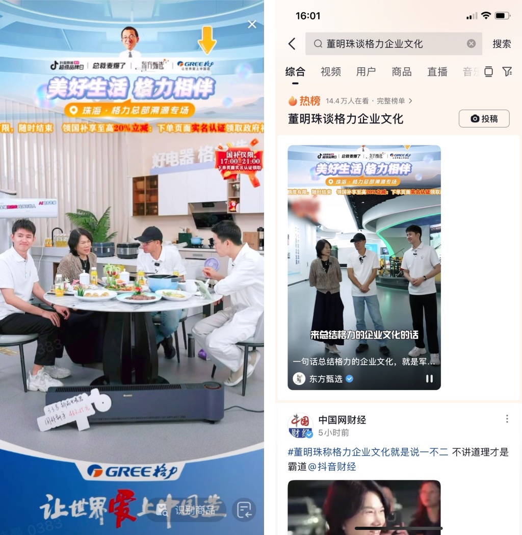 去年雙十一期間,格力總裁董明珠三顧抖音電商直播間,其中一場特別來到了東方甄選的直播間,和新東方創(chuàng)始人俞敏洪進(jìn)行了“合體”直播,期間還參觀了格力工廠,聊到了企業(yè)文化、創(chuàng)新研發(fā)等話題,暢談“中國智造、以舊換新”。