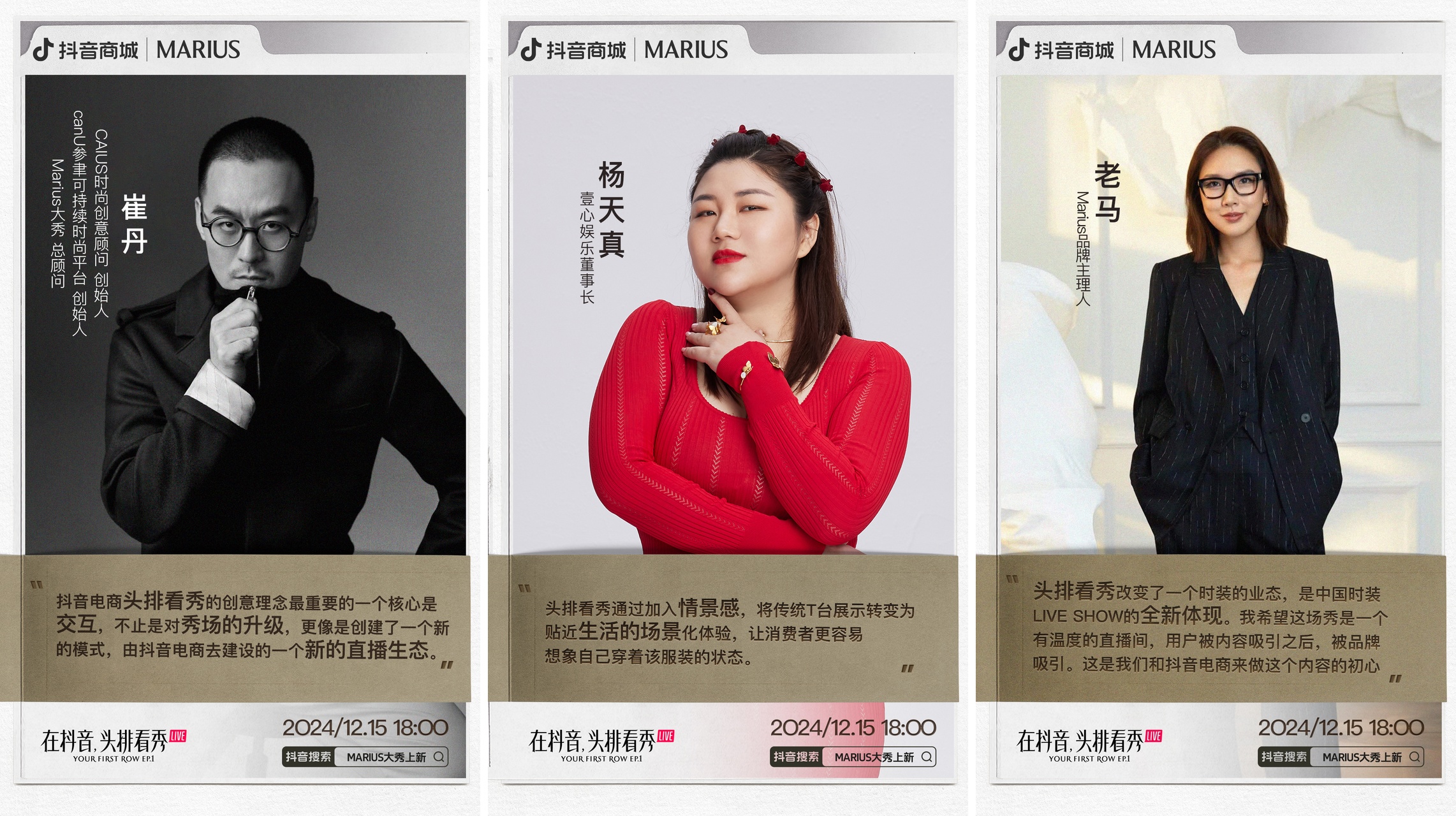 在內(nèi)容創(chuàng)造的新體驗(yàn)感之下,產(chǎn)品不再只是“冷冰冰”的商品。去年12月,紅人品牌老馬Marius 通過合作抖音電商「頭排看秀」項(xiàng)目,借著新品發(fā)布的機(jī)會,落地首個「沉浸式劇場型」直播大秀。宛如“坐在大秀頭排”的獨(dú)特體驗(yàn),使其區(qū)別于常規(guī)的時尚秀場,為用戶留下了更深刻的印象。