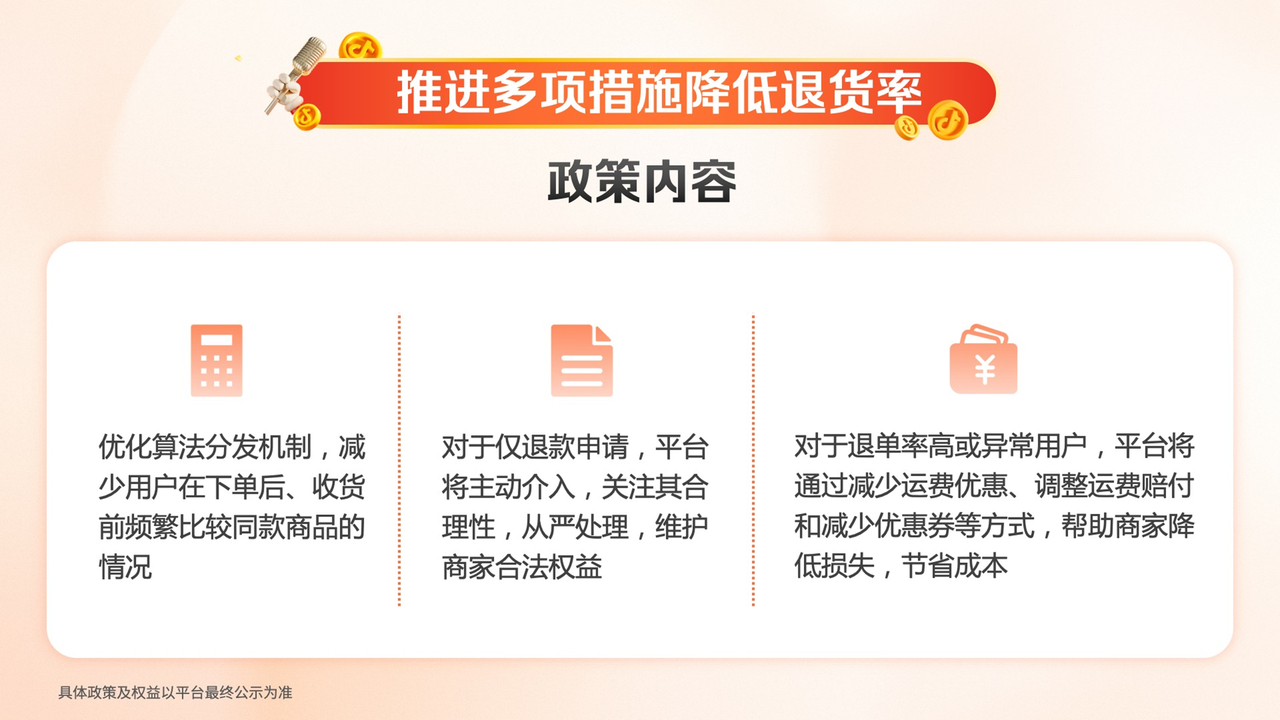 高退貨率是許多商家經(jīng)營過程中的痛點(diǎn)、難點(diǎn),也是影響利潤空間的關(guān)鍵。抖音電商通過多項(xiàng)舉措穩(wěn)住退貨率,降低經(jīng)營損失,包括優(yōu)化算法分發(fā)機(jī)制、主動(dòng)介入、調(diào)整優(yōu)惠等方式。