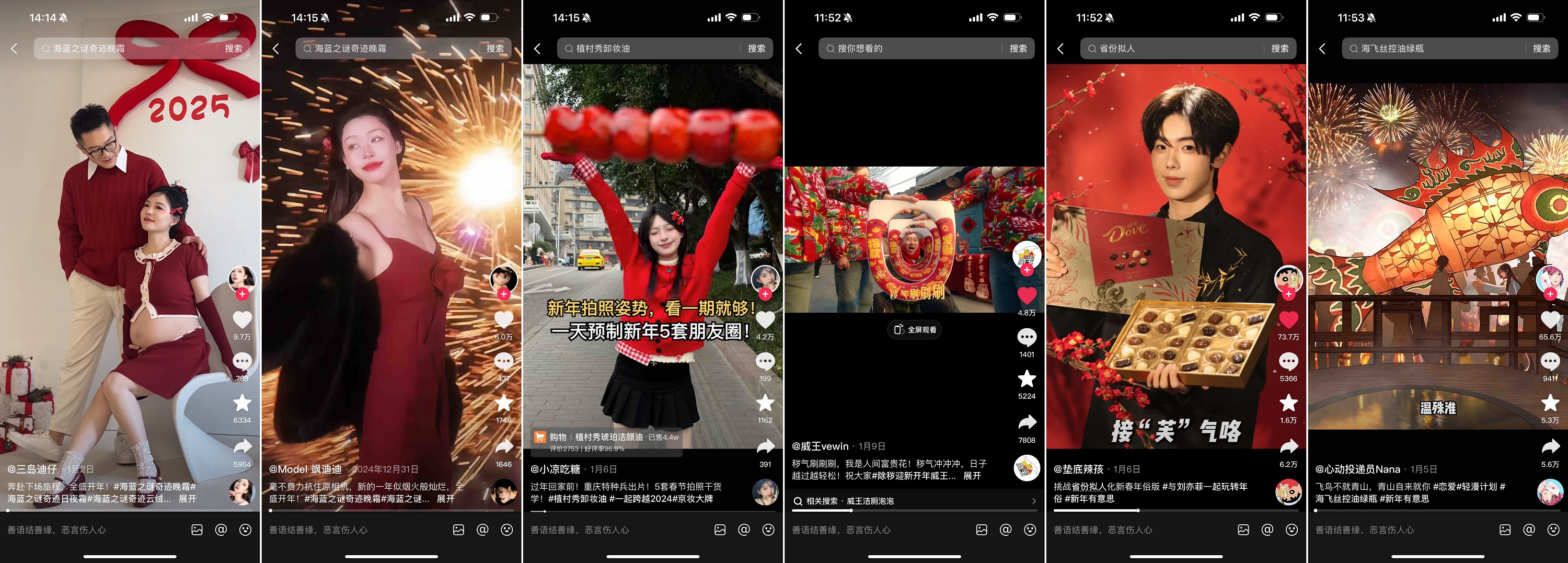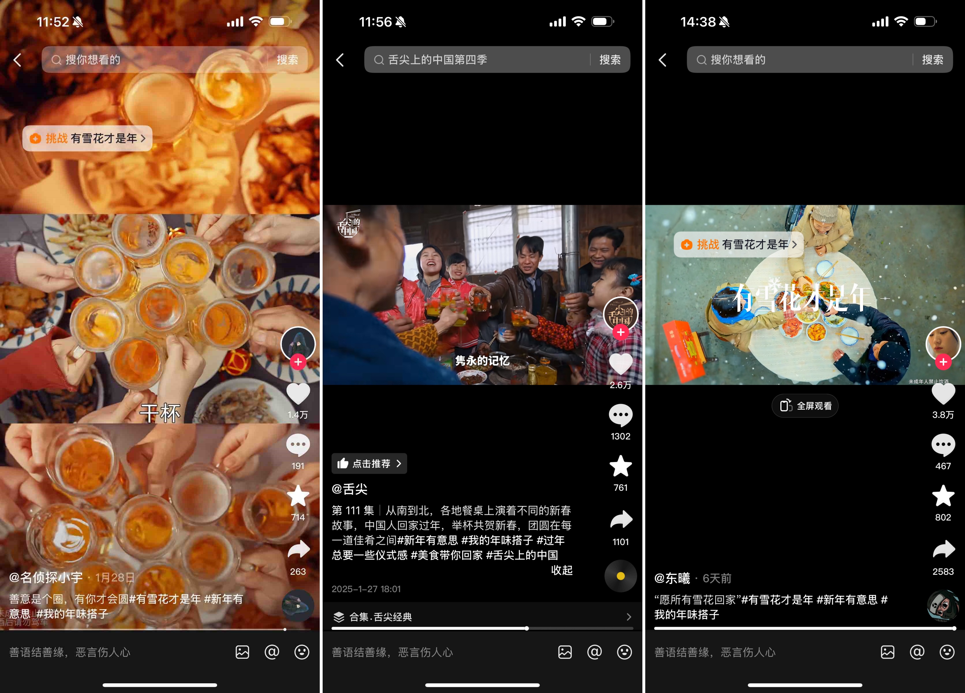 例如,圍繞“家鄉(xiāng)年味”“城市年俗”“春節(jié)預(yù)制朋友圈”等內(nèi)容主題,達(dá)人們用短視頻記錄下各地的春節(jié)特色與過年劇情演繹,既滿足了用戶的情感共鳴,也為品牌提供了自然融入的傳播場景,完成了"內(nèi)容即貨架"的沉浸式體驗(yàn)升級(jí)。