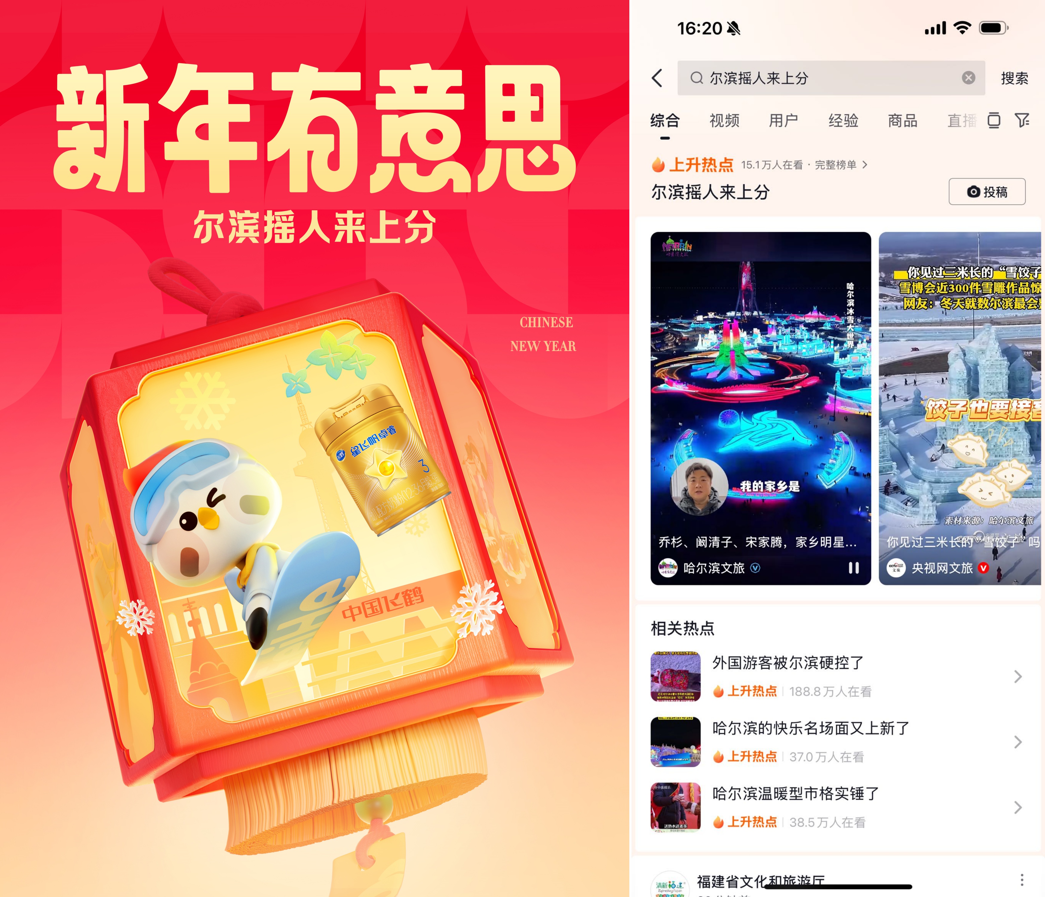 在巨量星圖IP「新年有意思」中,飛鶴以冠名身份攜手全國用戶共慶乙巳年新春,通過#爾濱搖人來上分、#飛鶴為爾濱上大分 話題活動(dòng),打造了城市文旅營銷的創(chuàng)新標(biāo)桿。