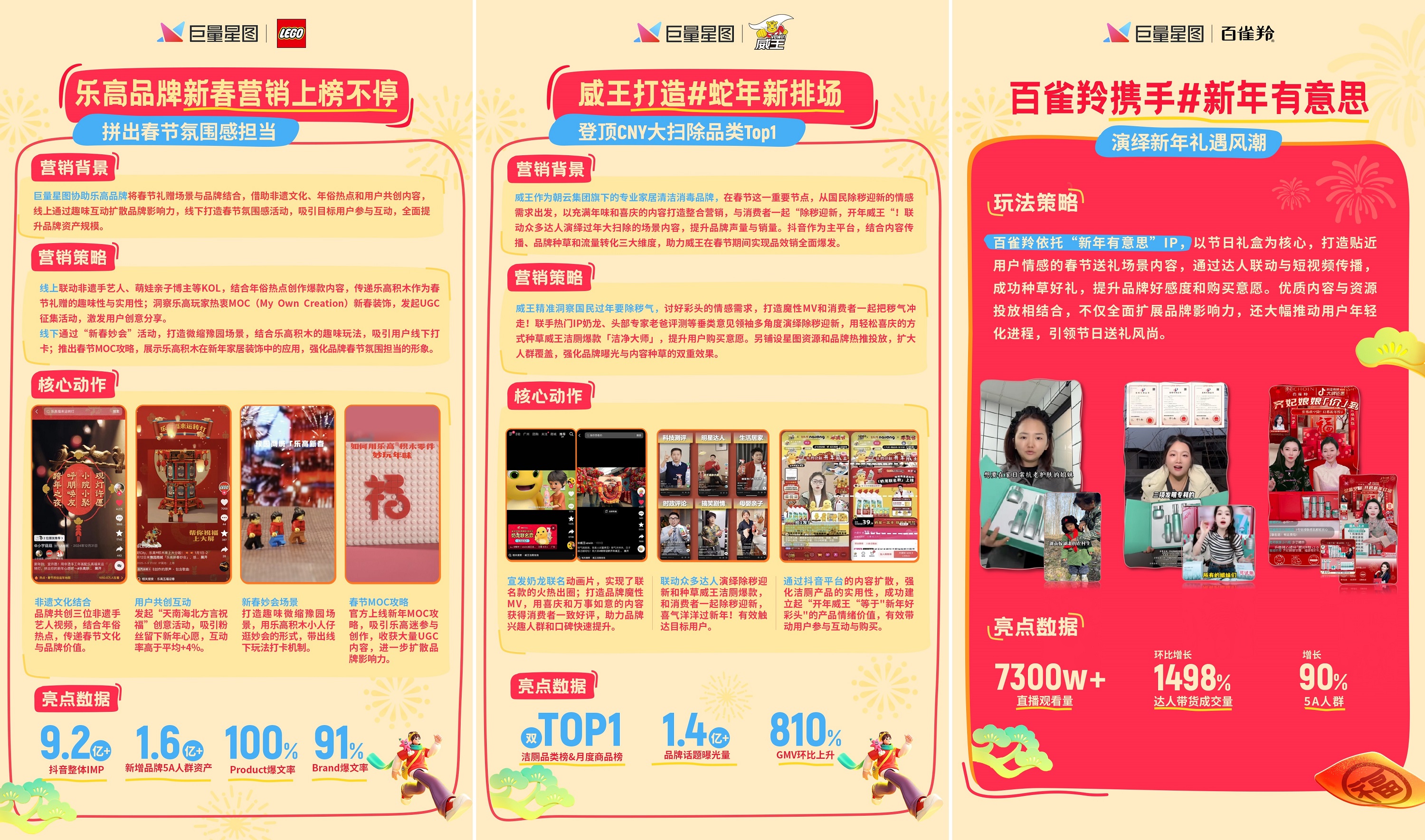 • 樂高品牌通過非遺文化共創(chuàng),將樂高積木玩法與春節(jié)氛圍巧妙結(jié)合,成功收獲9.2億+抖音曝光,成為春節(jié)氛圍感擔(dān)當(dāng);