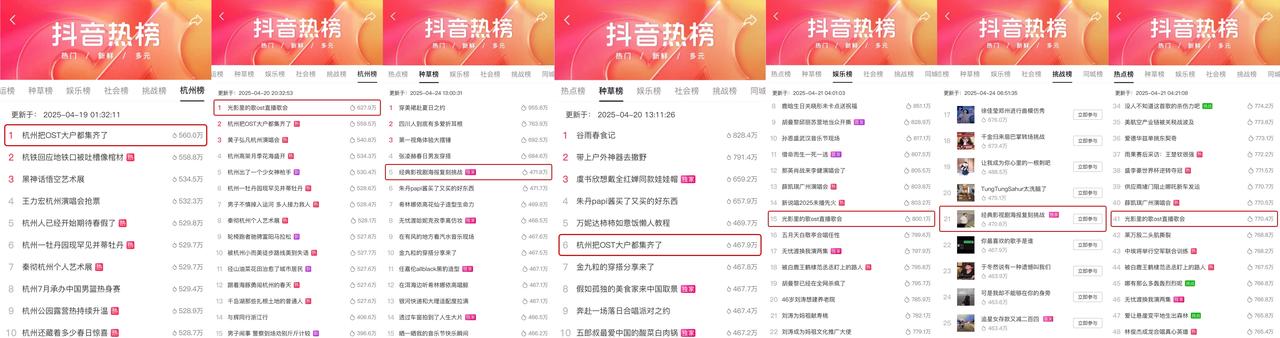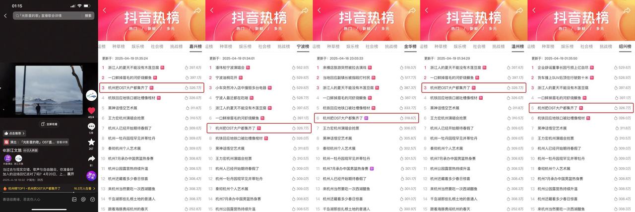 擁有“千年宋韻風(fēng)情”的杭州作為眾多影視劇的拍攝地與本次歌會有著天然的適配度,從百年古剎中的武俠氛圍到現(xiàn)代約會圣地的浪漫氣息,杭州就像是一個巨大的“平行時空”,等待著各式各樣的“生活主角”光臨,由抖音演出與杭州文旅共創(chuàng)的《用影視ost打開杭州》,透過杭州風(fēng)景傳遞演出消息,釋放演出陣容,為這場歌會增加熱度,#杭州把OST大戶都集齊了 話題榮登抖音杭州同城榜TOP1,種草榜TOP19,優(yōu)質(zhì)內(nèi)容集聚發(fā)酵,輻射杭州周邊,登上溫州榜TOP4等多個地域榜單高位。