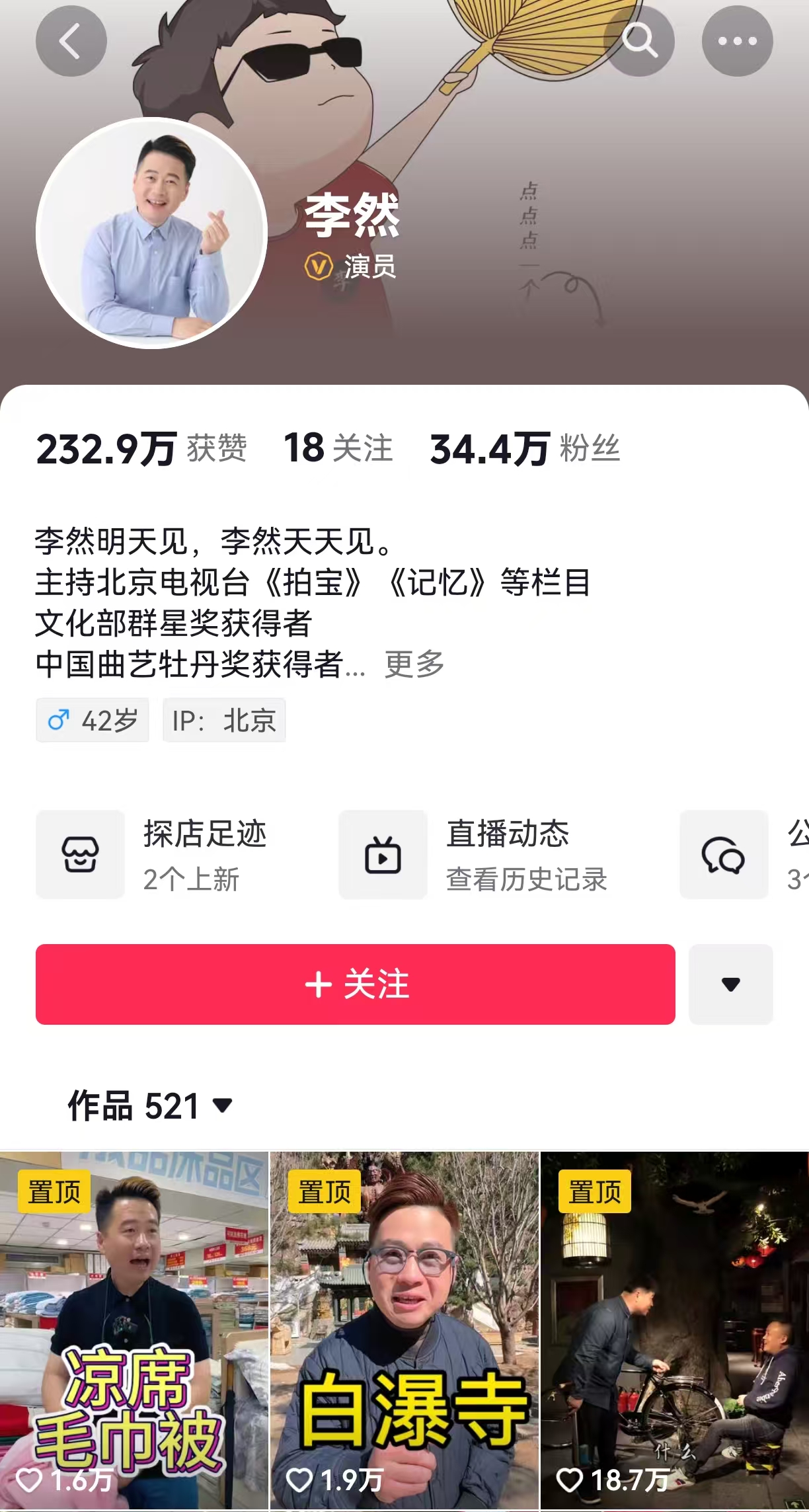 這是李然抖音主頁(yè)的一句自我簡(jiǎn)述。在許多北京觀眾心中,李然,是一個(gè)十分熟悉的名字——出生北京,自小酷愛曲藝,師承相聲大師孟凡貴先生,李然以相聲演員的身份年少成名,獲得過中國(guó)曲藝牡丹獎(jiǎng)等重磅獎(jiǎng)項(xiàng);此后,延續(xù)“說”的藝術(shù),李然成為了北京廣播電視臺(tái)的主持人,活躍熒屏數(shù)十年。他主持過《拍寶》《記憶》等重要欄目,也主持過美食節(jié)目。“那個(gè)走街串巷找美食的主持人”,是許多觀眾說起他時(shí)的第一印象。