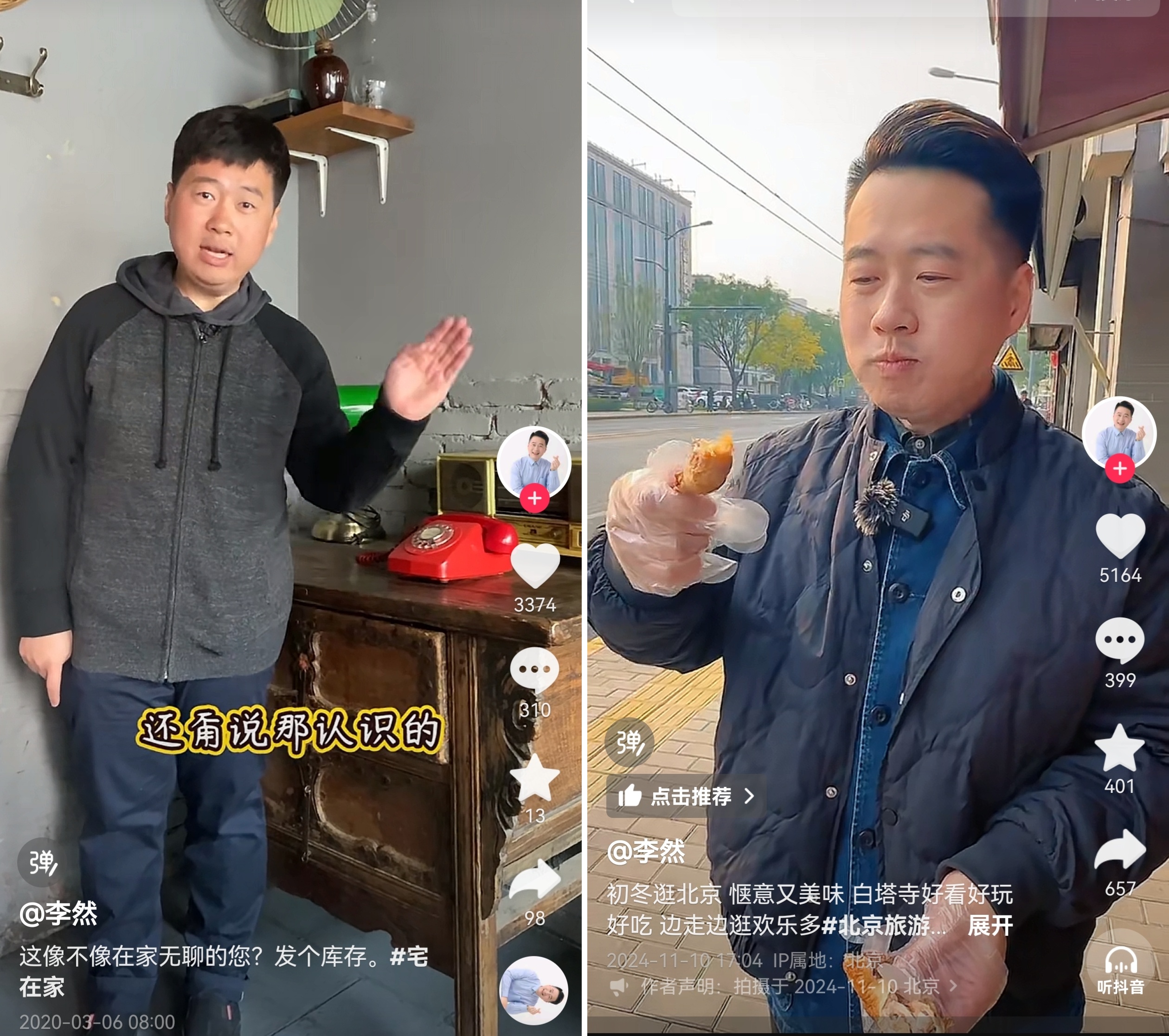對(duì)于李然這位地地道道的“老北京”而言,抖音是個(gè)充滿可能性的空間。“電視節(jié)目的時(shí)間有限,在那里,我或許能夠表達(dá)60%的自己;而在這里,可以更多地表達(dá)我的所見、所愛、所想。”從菜團(tuán)子到門釘肉餅,從巷間夜市到著名景點(diǎn),從生活日常到歷史痕跡,李然源自語言節(jié)目的濃郁本土風(fēng)格,與他對(duì)這片土地的熱愛交融在一起,創(chuàng)造出獨(dú)特的辨識(shí)度和影響力。目前,他在抖音個(gè)人賬號(hào)的粉絲超過34萬。