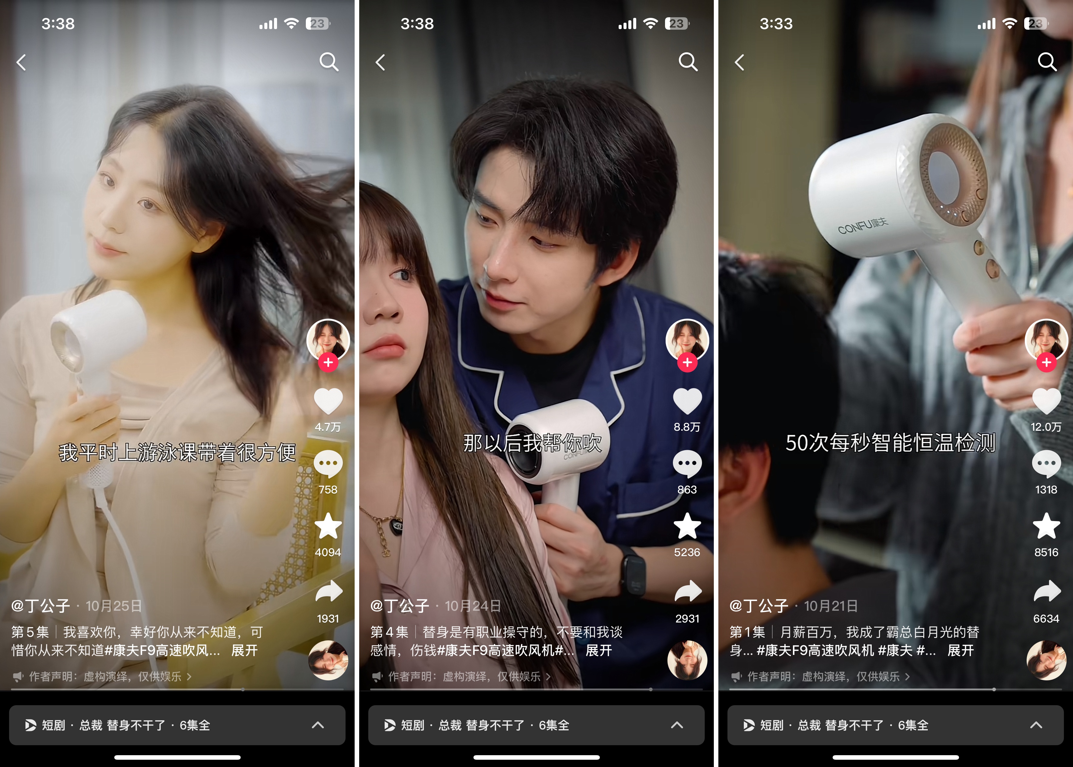 康夫夢(mèng)幻聯(lián)動(dòng)@丁公子 實(shí)力上演霸道總裁題材定制短劇《總裁替身不干了》,將康夫F9高速吹風(fēng)機(jī)巧妙融入進(jìn)劇情中,最終總曝光獲得超6600萬播放量,新增5A人群超1400萬,新增A3人群超310萬, 創(chuàng)造了日均搜索UV提升700%的成績(jī)!