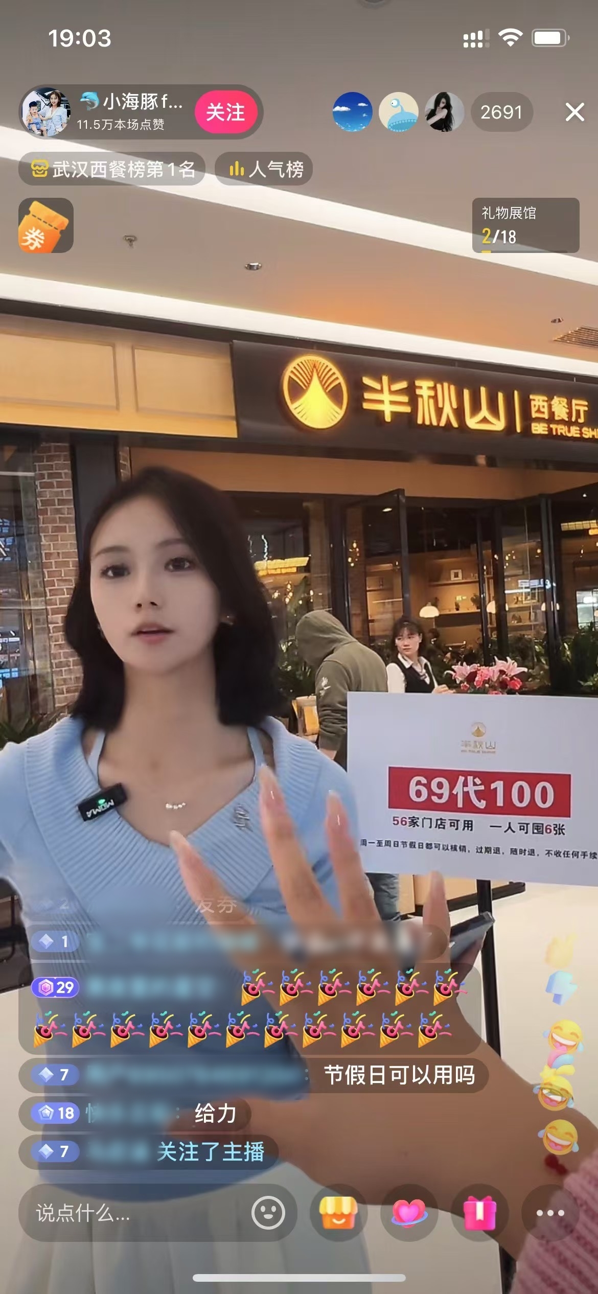 11月17日,@小海豚family 聯(lián)手武漢中式西餐品牌商家半秋山開啟直播首秀,當日便創(chuàng)下了直播間高峰期在線超2500人、單日GMV近300萬的成績。