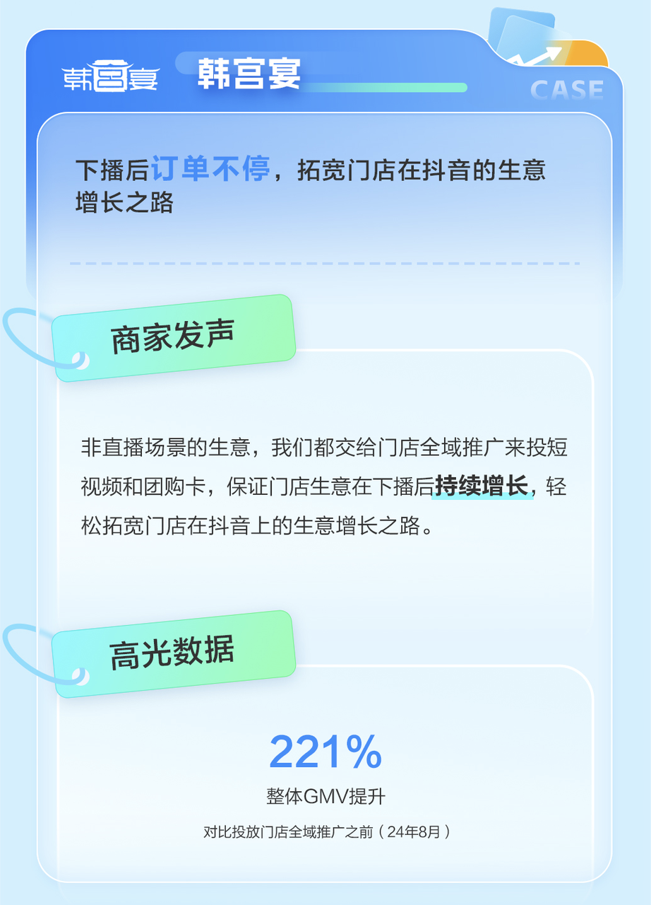 「門店全域推廣」為商家提供直播以外的第二條生意增長曲線,直播商家即使下線,依然可以訂單不停;非直播商家不做直播也能獲取新的生意增量。近年,韓宮宴在直播業(yè)務的推動下生意增速顯著,但依然想探索全新增量,于是決定開啟「門店全域推廣」,使用產(chǎn)品后,其整體GMV提升221%,成功破解了直播外的增長難題。