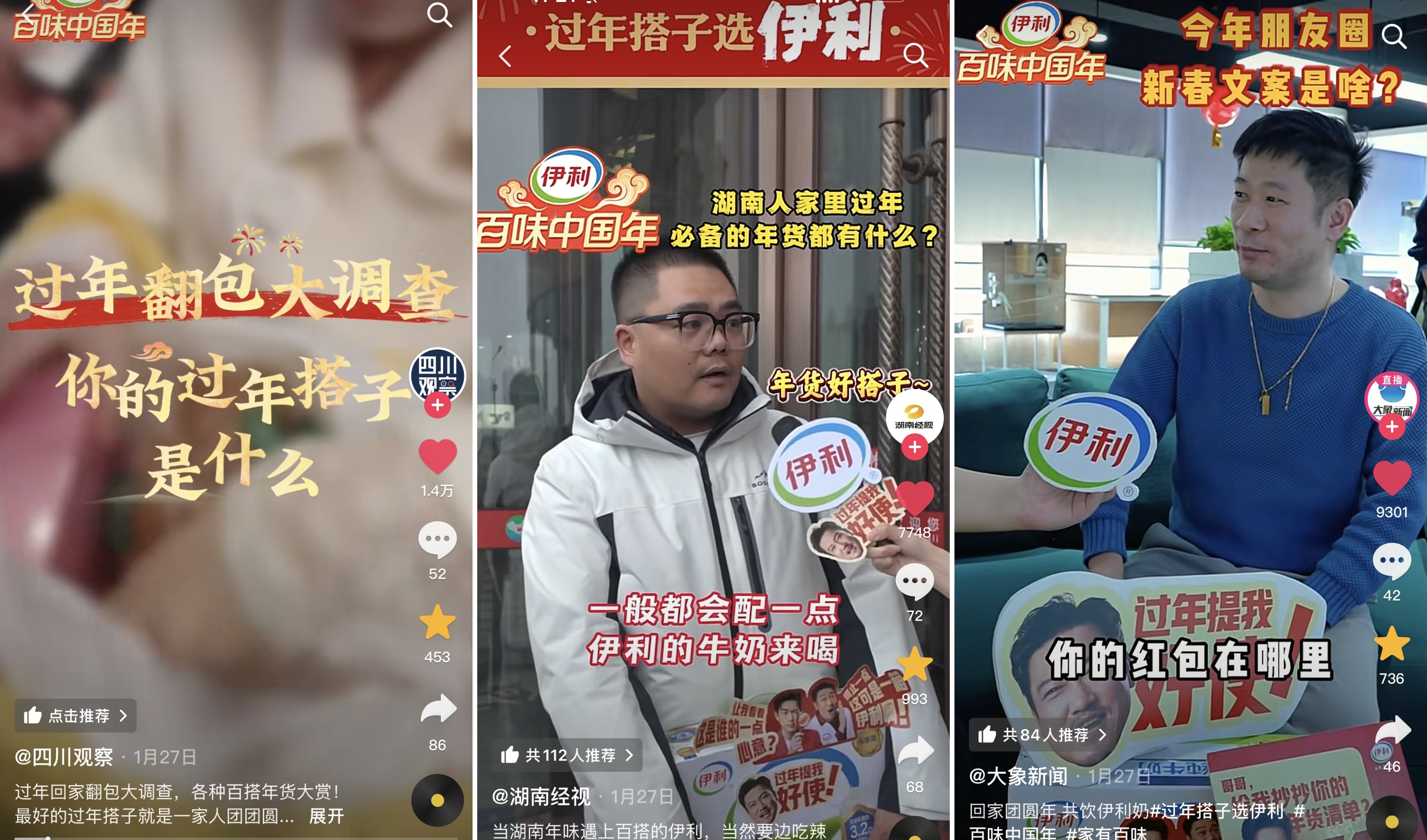 25家媒體深入市井街巷探訪年味:四川觀察開(kāi)展“過(guò)年翻包大調(diào)查”,水果零食盲盒玩具甚至“假劉海”躍然眼前;湖南經(jīng)視鏡頭記錄下湘西臘肉與伊利純牛奶的早餐搭配,大象新聞則展現(xiàn)了一批諸如“多來(lái)米發(fā)梭拉西,你的紅包在哪里”的過(guò)年朋友圈趣味文案。這些充滿生活細(xì)節(jié)的片段,共同編織出當(dāng)代春節(jié)的精神圖譜。