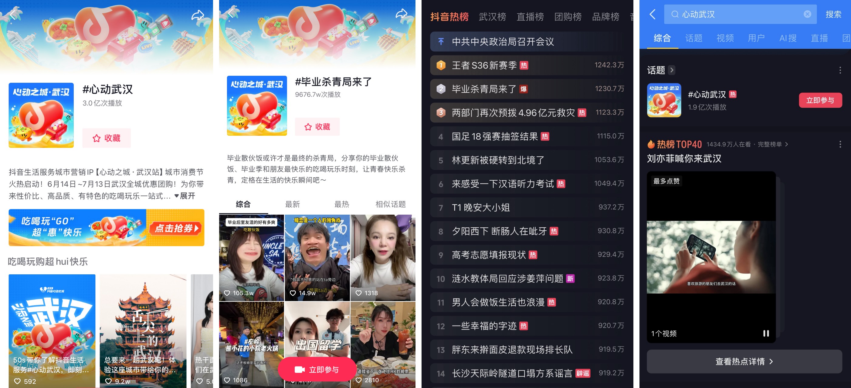 沉浸在吃喝玩樂(lè)的市民和游客,也沒(méi)忘記在網(wǎng)絡(luò)上留下自己的美好回憶。「心動(dòng)武漢」話題瀏覽量破3億,活動(dòng)期間共引發(fā)11個(gè)熱點(diǎn),其中#畢業(yè)殺青局來(lái)了 熱點(diǎn)全國(guó)榜top1,#劉亦菲喊你來(lái)武漢 熱點(diǎn)全國(guó)榜top33;#舌尖上的武漢、#江漢路真的有點(diǎn)東西 等熱點(diǎn)全國(guó)種草,每一個(gè)熱搜背后都是武漢本地市民和游客對(duì)「心動(dòng)武漢」的關(guān)注和參與。