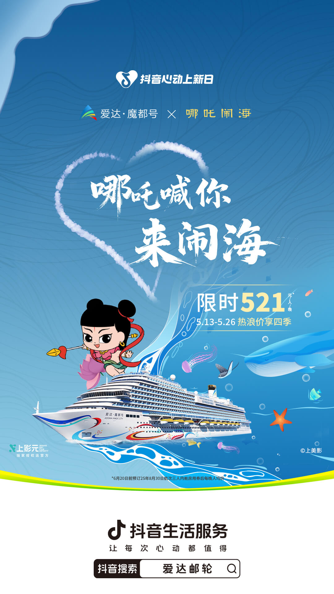 作為中國(guó)郵輪的旗艦郵輪企業(yè),愛(ài)達(dá)郵輪承載著國(guó)家對(duì)發(fā)展郵輪產(chǎn)業(yè)的期盼,擁有深厚的國(guó)民認(rèn)知度,其強(qiáng)大的官方背書(shū)奠定了品牌的實(shí)力與可靠性,旗下的兩艘全年運(yùn)營(yíng)大型郵輪——愛(ài)達(dá)·魔都號(hào)和愛(ài)達(dá)·地中海號(hào),穩(wěn)居中國(guó)市場(chǎng)體量首位。在618與暑期旺季雙節(jié)點(diǎn)到來(lái)之際,愛(ài)達(dá)郵輪聯(lián)動(dòng)承載數(shù)代人集體記憶的經(jīng)典國(guó)民動(dòng)畫(huà)“哪吒鬧海”,傳遞海上度假的新奇魅力與文化內(nèi)涵,深化消費(fèi)者對(duì)郵輪出行的認(rèn)知。