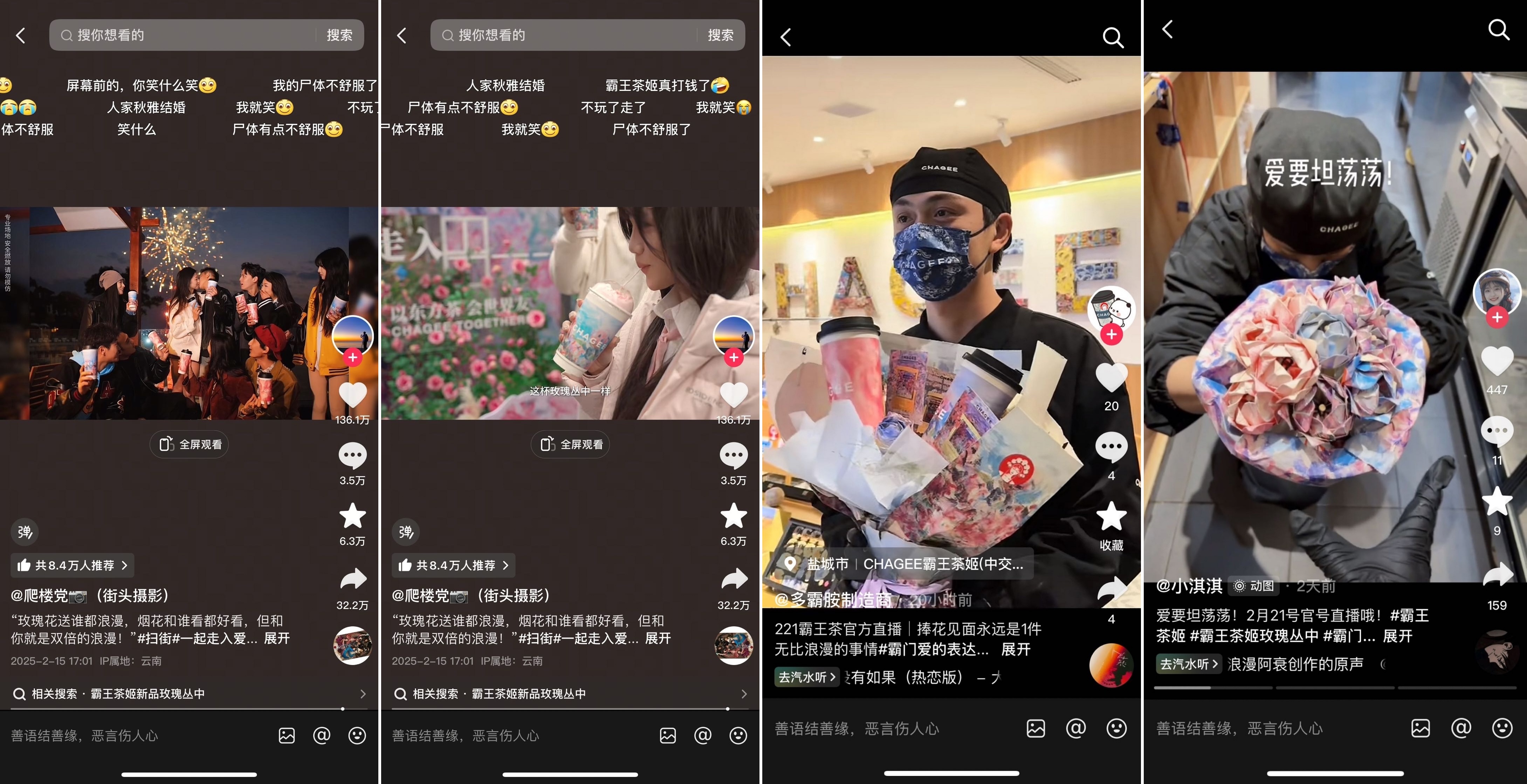 “玫瑰叢中”、“玫瑰花園”“玫瑰園”……霸王茶姬此次上新產(chǎn)品充滿了浪漫巧思,主打讓大家在滿口玫瑰清香里感受濃濃的愛;2月13日至2月26日,品牌還攜手「抖音心動上新日」共同探索限定海邊大場直播、達人測評打卡短視頻、系列預(yù)熱宣傳動作等熱門玩法,致力于陪伴大家儀式感地度過每一個愛意時刻。