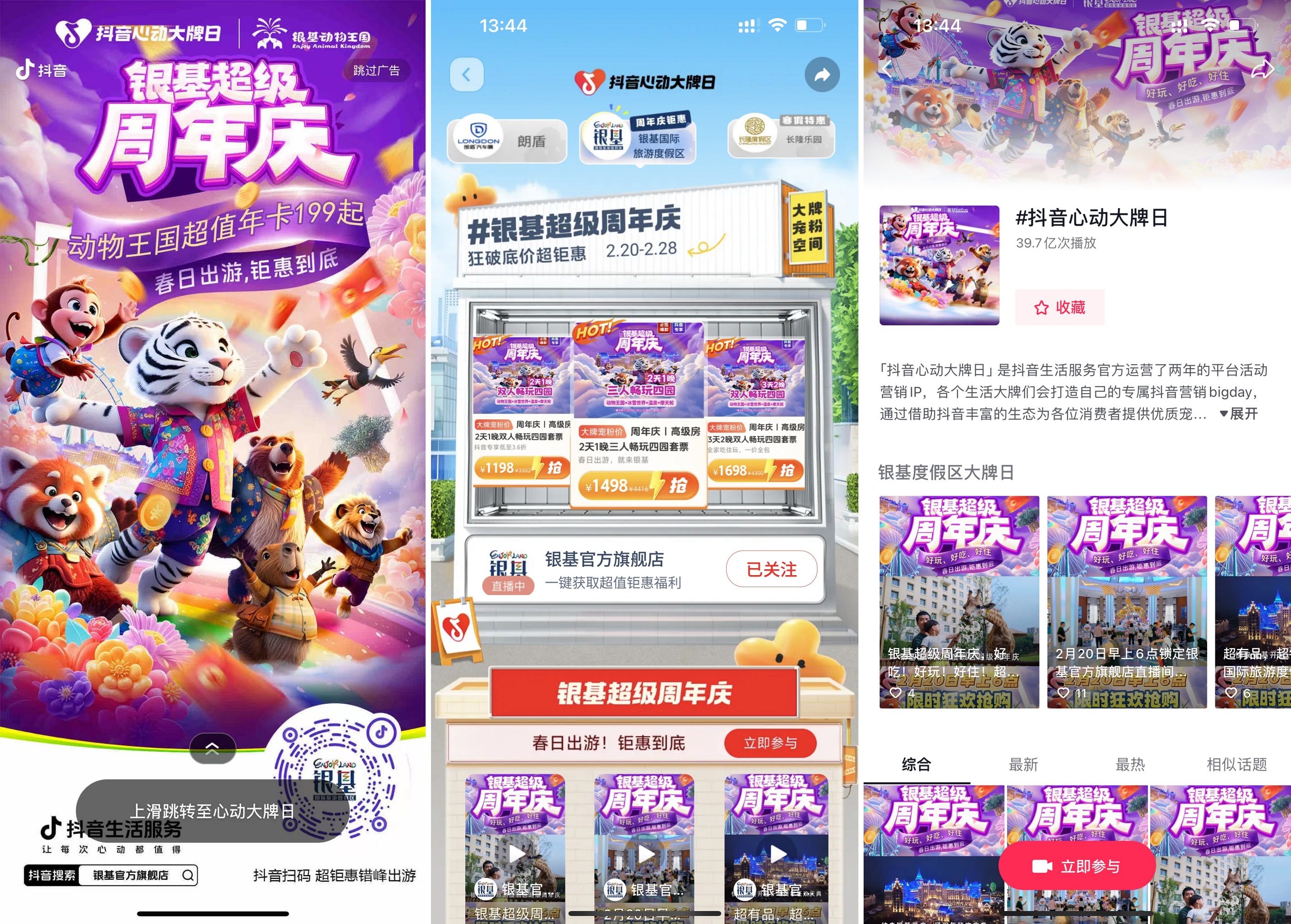 為了打造周年慶節(jié)點(diǎn)“大事件”,銀基攜手「抖音心動(dòng)大牌日」推出了針對(duì)不同人群的特惠景酒套餐、動(dòng)物王國(guó)主題年卡等超值福利,主打全方位“助攻”大家的春日之旅;并通過官方賬號(hào)聯(lián)動(dòng)達(dá)人滾動(dòng)開播、短視頻廣泛曝光、線下大屏強(qiáng)勢(shì)種草等玩法“多管齊下”,致力于讓每位到訪銀基國(guó)際旅游度假區(qū)的游客都能“不虛此行”,以一場(chǎng)超級(jí)周年慶大促多方面升級(jí)了大家的互動(dòng)體驗(yàn)。