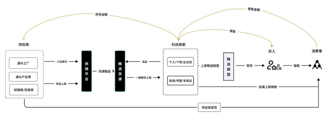 不難看出,抖音電商供銷平臺最大的優(yōu)勢,是大大縮短交易的中間環(huán)節(jié),降低了運(yùn)營成本,從而為供應(yīng)商和分銷商、抖店、達(dá)人提供了更多直接合作的機(jī)會。