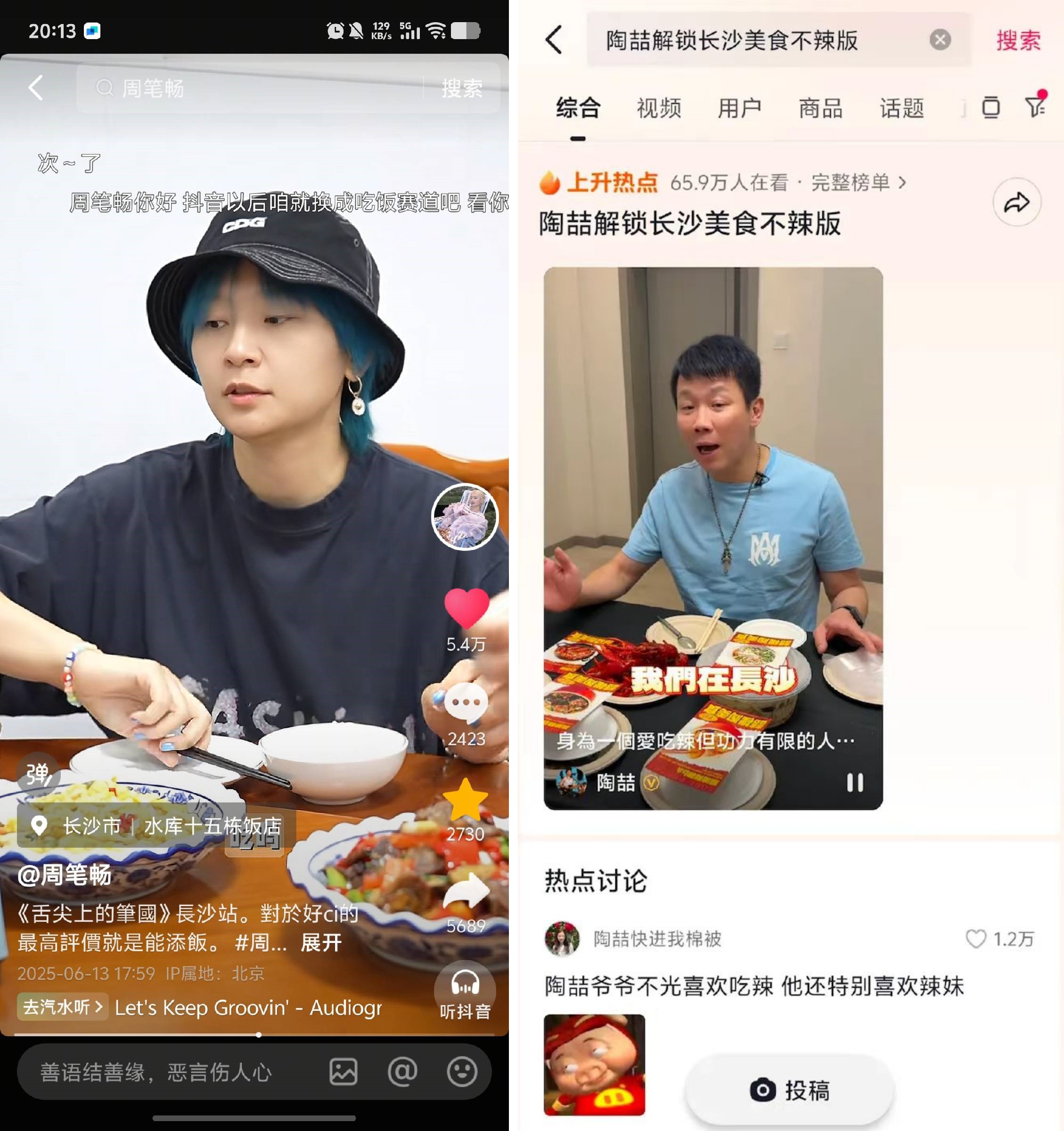 基于明星效應(yīng)的勢能滲透,演唱會資源進一步拓展了消費場景。周筆暢演唱會期間,空中巴士巡游與十大商圈戶外大屏組成城市級應(yīng)援網(wǎng)絡(luò),獲得了超500萬曝光量,衍生的城市漫游內(nèi)容加深了與本地用戶的連接;6月21日陶喆演唱會則通過長沙美食盲盒體驗vlog和演唱會海報物料授權(quán)商家的機制,將粉絲熱情轉(zhuǎn)化為到店消費行為,驗證了娛樂流量向?qū)嶓w消費的轉(zhuǎn)化路徑。
