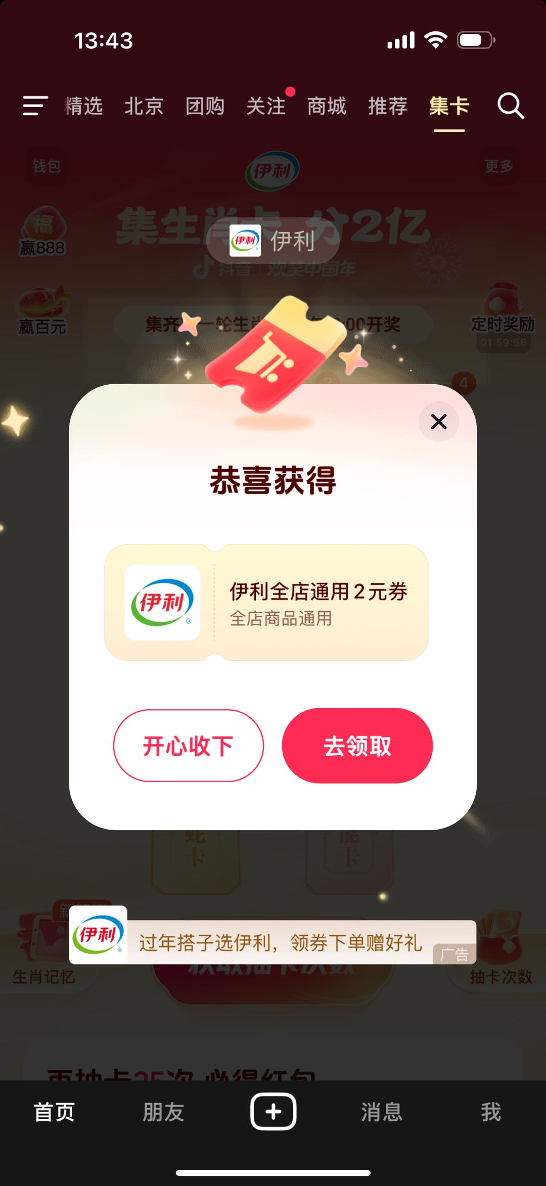 看得出來,抖音希望通過營造歡樂好玩的場景,將春節(jié)節(jié)點的巨大流量注入到內(nèi)容IP當中。而伊利、中國聯(lián)通、邊鋒摜蛋、零食很忙等眾多品牌,則可以巧妙植入到「列車」到站提醒、做任務、紅包封面等游戲進程之中,吸引粉絲人群關注。比如一次獎勵是一張品牌代金券,品牌新春祝福視頻也有額外曝光機會。
