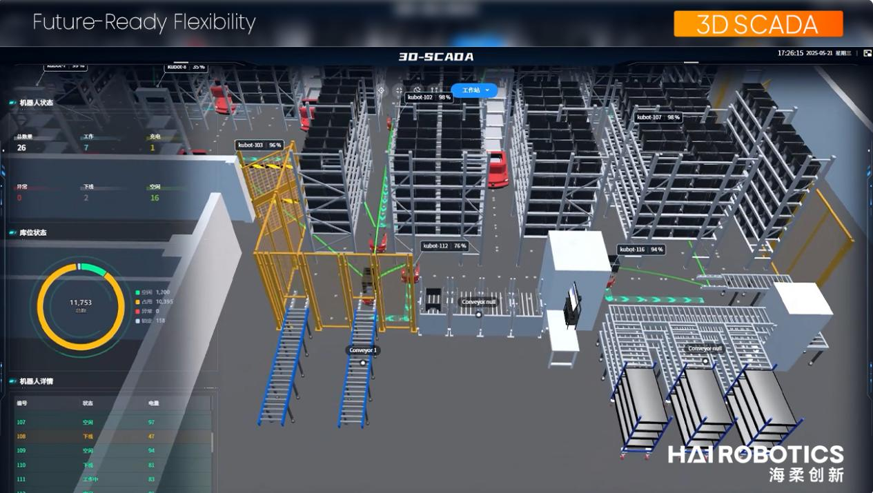 該倉庫深度融合海柔創(chuàng)新數(shù)字孿生技術(shù),通過1:1數(shù)字孿生體映射物理倉庫,實現(xiàn)全域設(shè)備狀態(tài)、庫存分布、作業(yè)進度的三維可視化監(jiān)控與秒級響應(yīng)。在3D SCADA數(shù)字孿生平臺的“全景視角”下,武漢工廠大幅提升了生產(chǎn)計劃與物流調(diào)度協(xié)調(diào)效率,使倉儲運營真正實現(xiàn)"預(yù)測式管理"。