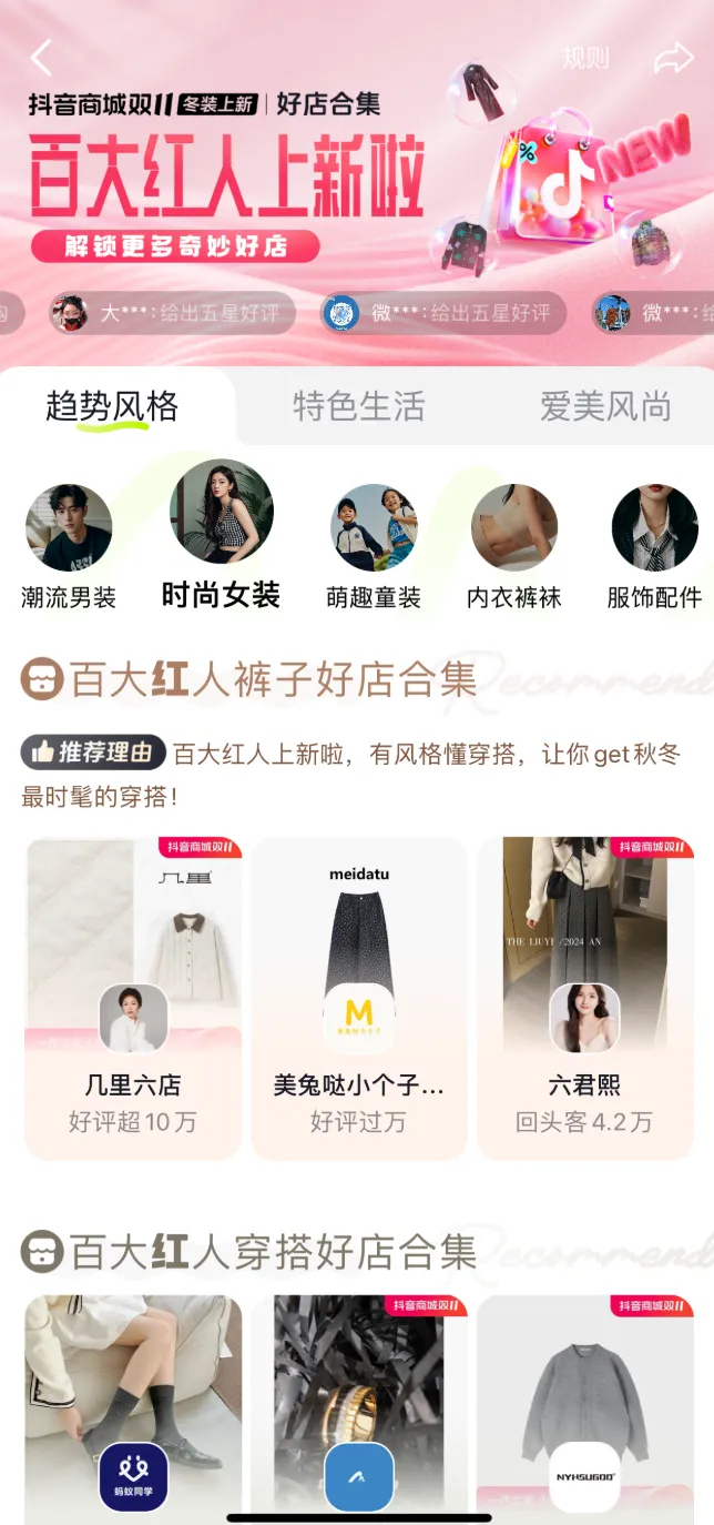 在雙11期間,抖音電商還上線(xiàn)了極具平臺(tái)特色的冬裝上新品類(lèi)日與「百大紅人上新啦」活動(dòng)。各大頭部服飾品牌、抖音電商作者與服飾主理人紛紛加入「服飾上新」大潮,為抖音用戶(hù)帶來(lái)款式豐富的應(yīng)季新品。就在這一天,服飾品類(lèi)上新超過(guò)17000款,整個(gè)服飾品類(lèi)都迎來(lái)流量與銷(xiāo)量雙重爆發(fā)。