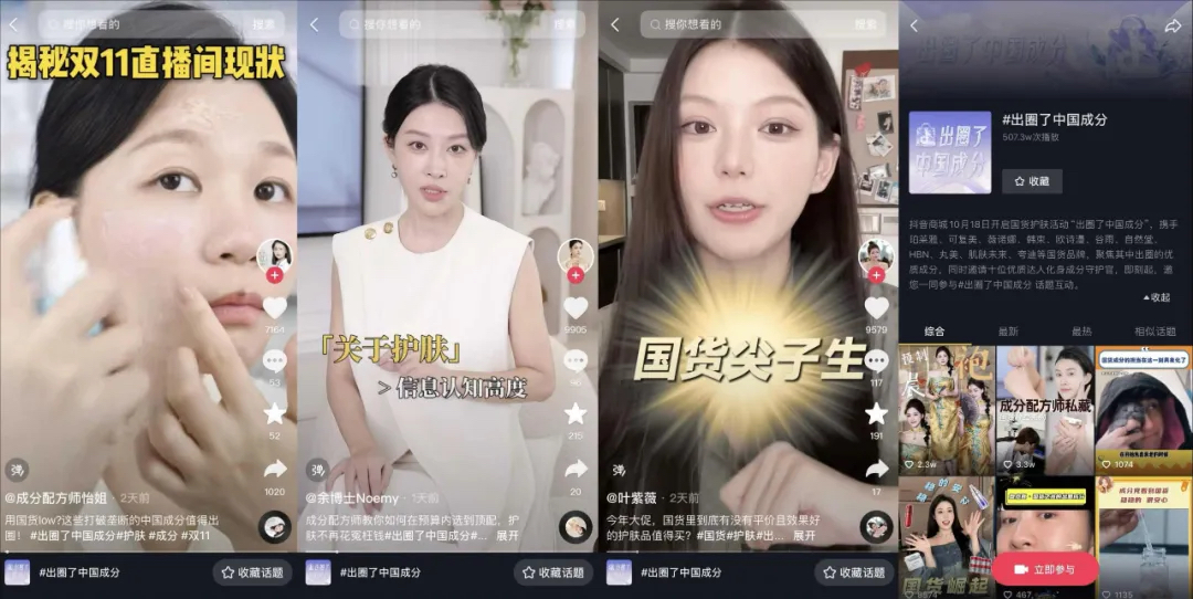 作為國(guó)貨生意爆發(fā)的前沿陣地和達(dá)人推廣國(guó)貨的優(yōu)選平臺(tái),抖音電商在助力國(guó)貨出圈方面成績(jī)可圈可點(diǎn)。今年雙11,抖音電商推出的「出圈了中國(guó)成分」主題傳播活動(dòng),不僅助力國(guó)貨護(hù)膚品牌深挖「成分」這一核心優(yōu)勢(shì),更以「種拔草一體」的全鏈路經(jīng)營(yíng)打法,為品牌立體營(yíng)銷(xiāo)打了樣。