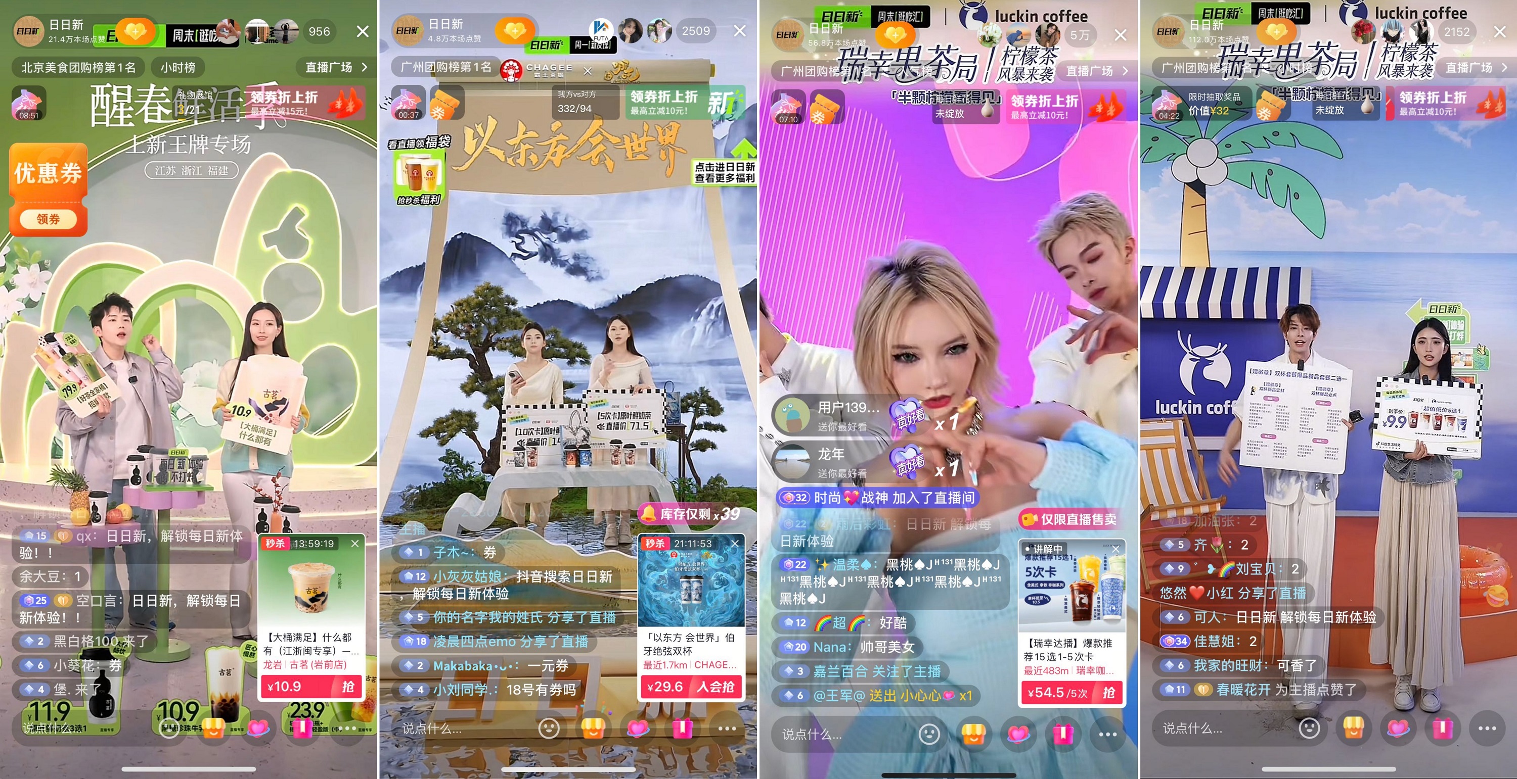 抖音官方賬號@日日新 也成為用戶獲取新鮮資訊的核心陣地。每日直播間聯(lián)合不同品牌推出專屬優(yōu)惠,如“周一新發(fā)現(xiàn)”與古茗合作,同步上線兩款符合年輕人口味的新品輕體*果蔬瓶、黑桑鳳梨;霸王茶姬X哪吒聯(lián)名品上新,創(chuàng)意水墨卷軸直播間打造超強(qiáng)氛圍體驗(yàn),直播交易近1500W;瑞幸X鐘倩兒嘗試男/女團(tuán)內(nèi)容直播間,單分鐘最高在線人數(shù)突破12W,打響上新聲量,實(shí)現(xiàn)人群破圈,助力品牌品效雙收;直播間內(nèi)設(shè)置1分錢福袋、滿減券以及各種“秒殺價(jià)”,以優(yōu)惠力度強(qiáng)化用戶“日日參與”的習(xí)慣。同時(shí),活動(dòng)賬號持續(xù)發(fā)布視頻內(nèi)容,圍繞當(dāng)下主題的吃喝玩樂攻略、活動(dòng)優(yōu)惠信息及官方直播間核心福利,給到用戶每日新選擇,以內(nèi)容強(qiáng)化欄目“消費(fèi)靈感庫”的定位。