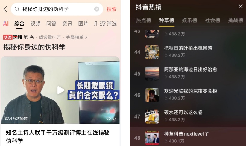 后續(xù)網(wǎng)友更將兩位科普大咖在直播中實(shí)用的科普內(nèi)容剪輯成短視頻分享到網(wǎng)絡(luò)上,相關(guān)內(nèi)容話題#種草科普nextlevel了 和#揭秘你身邊的偽科學(xué) 熱度破百萬,先后登上抖音和頭條熱點(diǎn)榜單,引發(fā)上百萬網(wǎng)友觀看和熱議。
