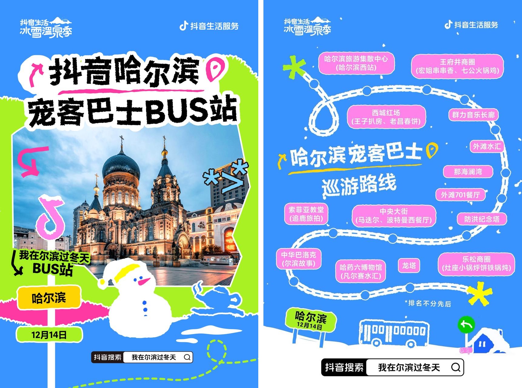 到了市區(qū),仍然有寵客巴士帶你盡情游玩:活動期間,抖音生活冰雪溫泉季聯(lián)合哈爾濱交通集團推出2條專線巴士,專為寵你而來!只要你抖音掃碼關注店鋪,即可獲得車票1張,憑票上車,即可享受觀光游玩、游戲互動等等一條龍服務,抖音帶你免費打卡多個好吃好玩的人氣地點!