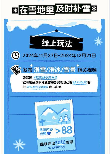 此外,活動周期內(11月27日至12月21日),只要你在抖音發(fā)布與雪場打卡、滑雪、滑冰或者雪景相關的視頻,并且?guī)匣顒釉掝} #燃雪越冬風向標,就有機會贏取免費雪票。
