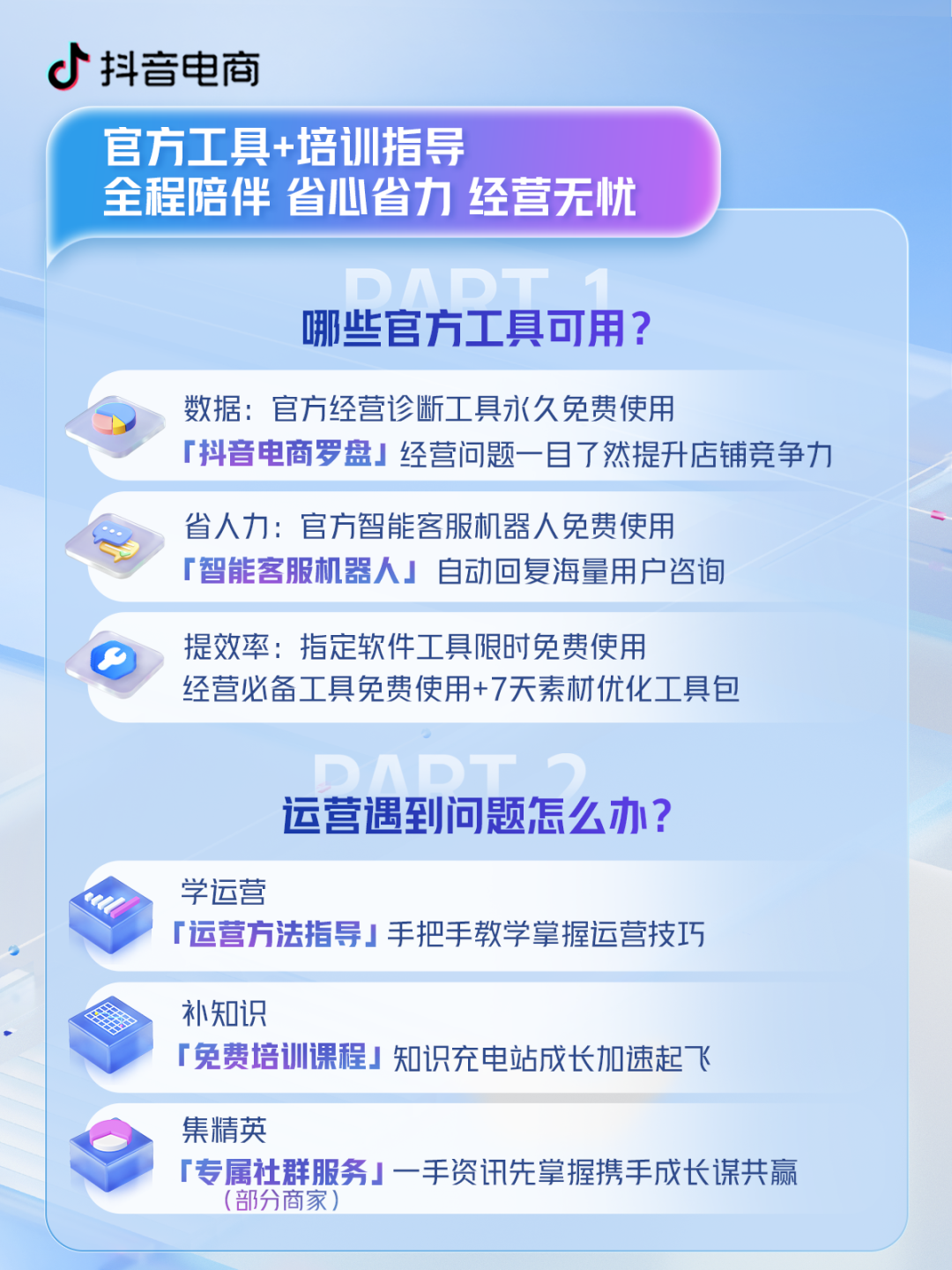 除此以外,抖音電商還為新商家提供了運營方法指導(dǎo)和免費培訓(xùn)課程,甚至有機會獲得專屬社群服務(wù)等等權(quán)益。