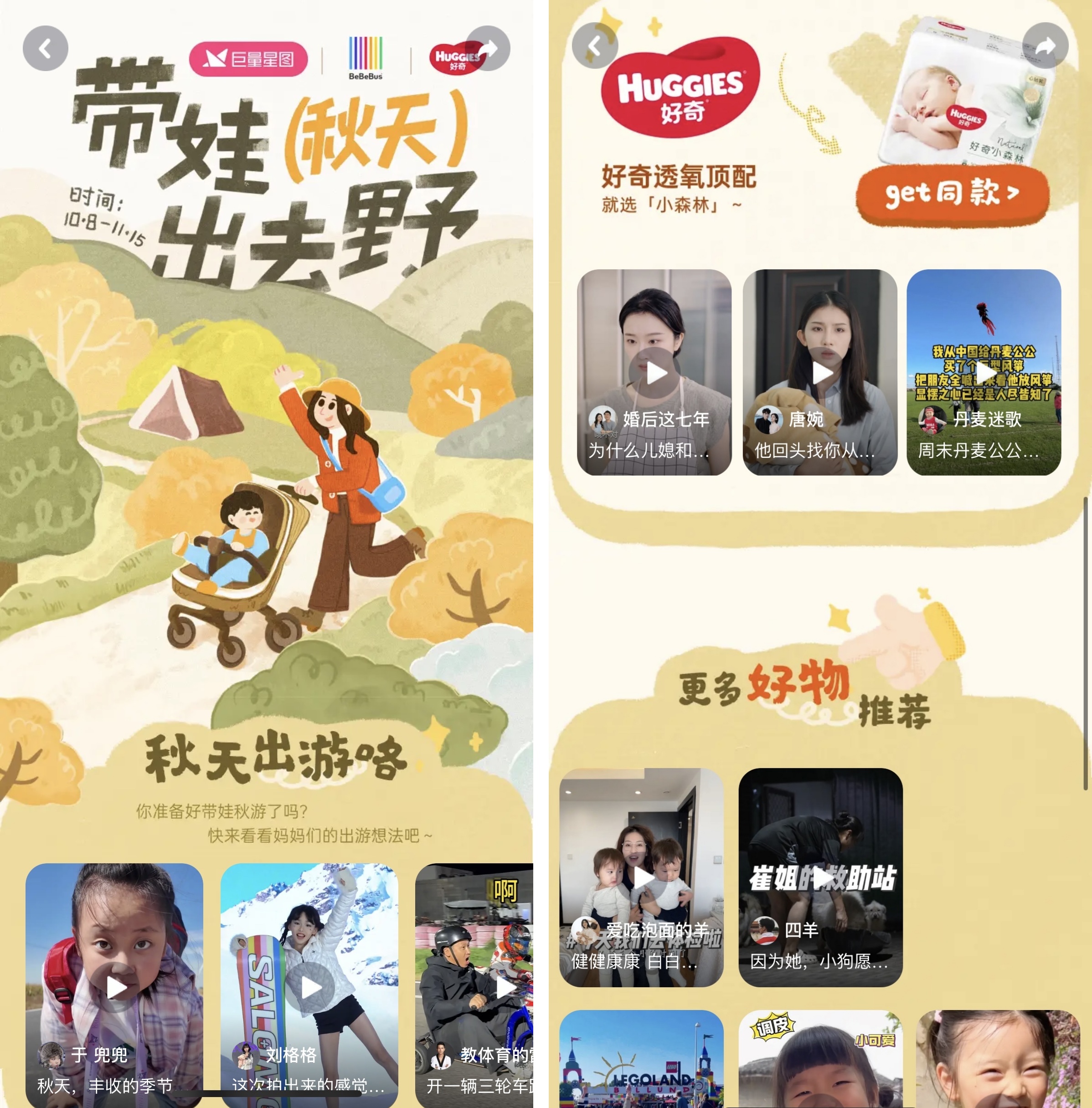 乘著節(jié)點的東風,在內容場景下,「帶娃秋天出去野」IP活動吸引了海量創(chuàng)作者創(chuàng)作聚焦秋游、親子生活等爆款內容。同時利用熱門話題、H5頁面、多個資源位曝光等方式植入品牌和產品信息,讓好奇品牌和秋日出行場景產生心智關聯,實現產品的大范圍“種草”。