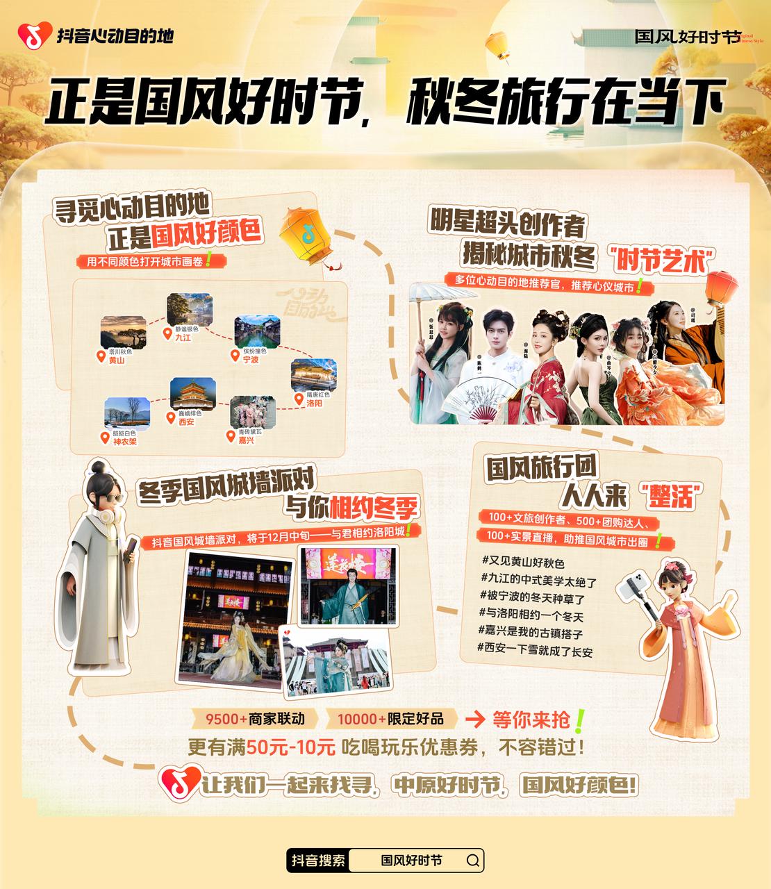 這個秋冬,抖音生活服務(wù)異地場景營銷IP「心動目的地」打造國風(fēng)系列第二期——「心動目的地·國風(fēng)好時節(jié)」,實(shí)現(xiàn)三重“心動升級”:行程更心動,橫跨11至12月,將先后抵達(dá)黃山、九江、寧波、神農(nóng)架林區(qū)、嘉興、西安、洛陽七個心動目的地,從層林浸染到大雪紛飛,在秋冬風(fēng)光淋漓盡現(xiàn)的地方,見證每一場浪漫;貨品更心動,精選地標(biāo)景區(qū)和六萬余款酒旅、餐飲商品,低至五折起,更有滿50-10元超值代金券每天限量開搶;玩法更心動,海陸、陳鶴一、司瑤等多位明星超頭出任「心動目的地推薦官」,與你同游國風(fēng)好去處。不僅將在洛陽等地舉行「國風(fēng)市集」等趣味線下大事件,還將在抖音發(fā)起#國風(fēng)好時節(jié) 線上話題互動,為創(chuàng)作者們送出豐厚流量獎勵!