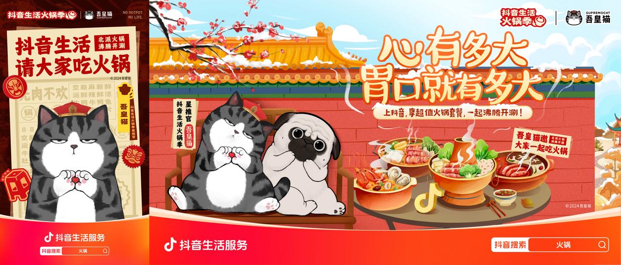美食加萌寵,生活樂無憂。抖音生活火鍋季x吾皇貓跨次元萌趣互動,閃現(xiàn)北京陽坊涮肉、濟(jì)南徐升記、沈陽大吉利、南京王和李海鮮火鍋大排檔店鋪,邀你一起「涮蘸撈」。吾皇作為深受大眾喜愛的國民IP,其酷萌又幽默的形象深入人心,個性的性格、傲嬌的氣質(zhì)也受到眾多用戶的追捧。此次抖音生活火鍋季與吾皇貓一起邀請大家暢快吃火鍋,get“心有多大,胃口就有多大”的新鮮美食體驗(yàn)!