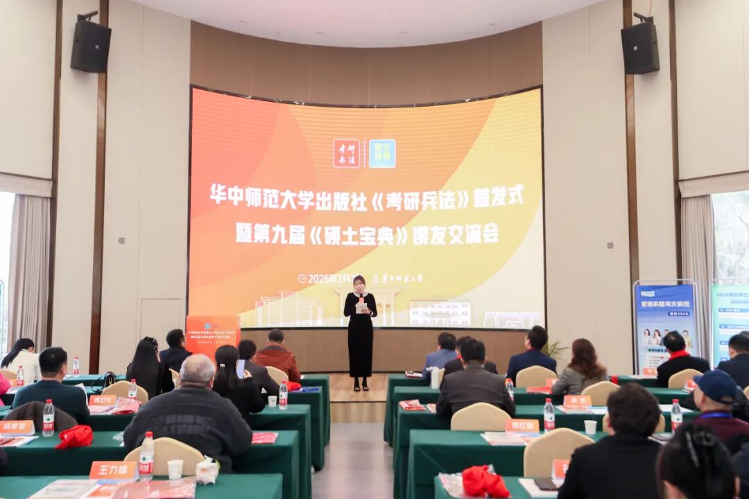 春風(fēng)有約,心向暖陽(yáng)。2026年3月7日,第九屆《碩士寶典》讀友交流會(huì)在華中師范大學(xué)學(xué)術(shù)交流中心成功舉行,來(lái)自全國(guó)各地的專家學(xué)者、合作伙伴、考研師資班學(xué)員、同仁讀者等60多人共聚一堂,書香相伴,進(jìn)行碩士業(yè)務(wù)交流與項(xiàng)目合作對(duì)接,共同謀劃更好地助力考研學(xué)子春季上岸。碩士項(xiàng)目運(yùn)營(yíng)人、華中師范大學(xué)出版社《考研兵法》主編、《碩士寶典》主編童偉圍繞“決勝之戰(zhàn):2026年春季考研復(fù)試調(diào)劑上岸攻略”的主題,進(jìn)行主旨分享。