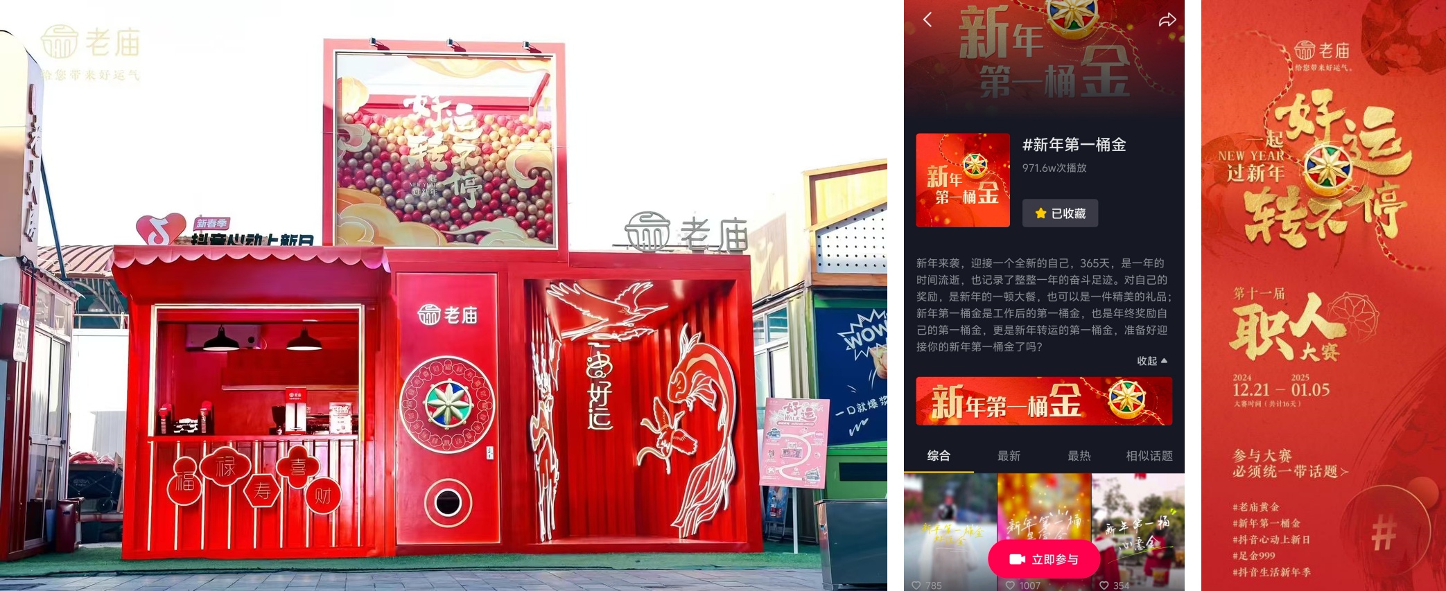 值得一提的是,老廟黃金還在上海豫園特別打造了“好運(yùn)轉(zhuǎn)不停”快閃活動(dòng),為前來(lái)打卡的用戶提供包括巨型扭蛋機(jī)、好運(yùn)拍照墻以及好運(yùn)咖啡暢飲在內(nèi)的多種趣味互動(dòng)體驗(yàn),邀請(qǐng)大家一起解鎖新年好運(yùn)的正確打開(kāi)方式。另外,結(jié)合新年戴金以求吉祥的傳統(tǒng)習(xí)俗,品牌聯(lián)合「抖音心動(dòng)上新日」在站內(nèi)發(fā)起熱點(diǎn)話題#新年第一桶金 ,以此加大品牌線上曝光度和內(nèi)容力輸出。從12月21日起,品牌更啟動(dòng)了為期16天的第十一屆職人大賽,鼓勵(lì)參與者圍繞#老廟黃金、#新年第一桶金、#足金999 等話題創(chuàng)作相關(guān)內(nèi)容,瓜分萬(wàn)元獎(jiǎng)金池,老廟黃金品牌共計(jì)27名相關(guān)人員上榜,其中3人更是躋身全國(guó)總榜top50。
