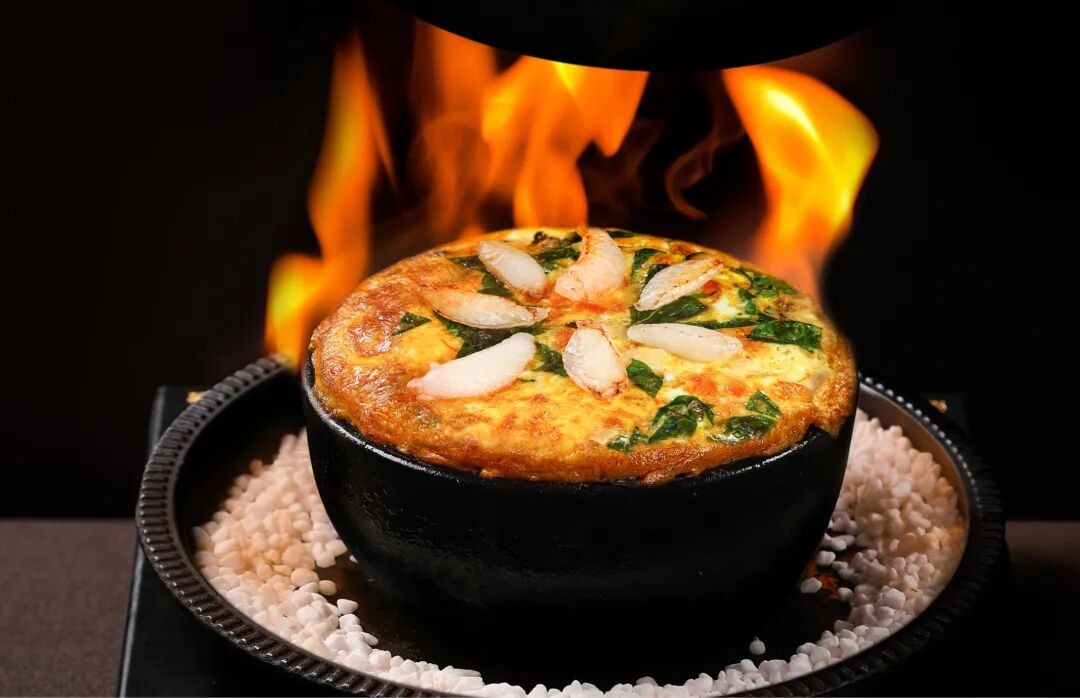 河南歷史名菜三鮮鐵鍋蛋,借助現(xiàn)代廚具創(chuàng)新烹飪技法,選用盧氏非遺綠殼雞蛋,加入蟹肉、海參、鮮蝦仁、荊芥等,上烤下烘,講究火候和時(shí)間的把控,色澤金黃,軟嫩鮮香。