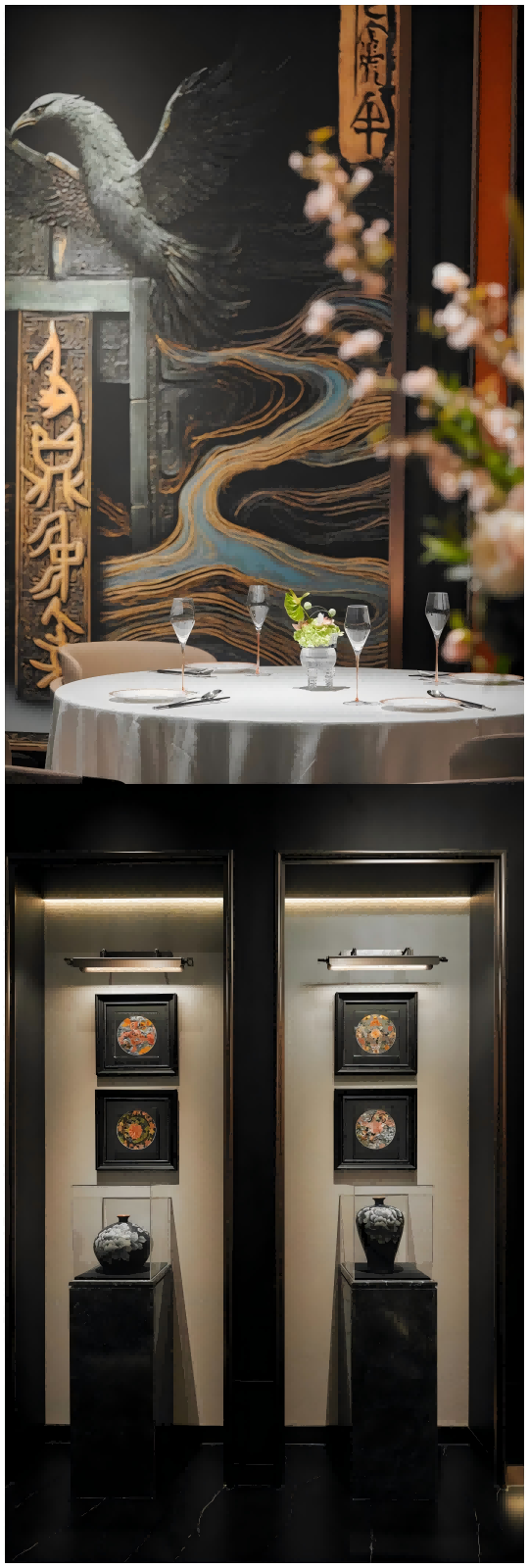 從融入鯉魚文化與商鼎文化的金屬拱形門頭,到潺潺如黃河奔涌的水幕墻;從非遺木雕的廚祖伊尹像,到轉(zhuǎn)角處不經(jīng)意邂逅的豫劇鳳冠與玄鳥紋樣——這不僅僅是餐廳,而是一座可沉浸式漫步的“河南文化體驗(yàn)館”。知名設(shè)計(jì)師以現(xiàn)代筆觸,將五千年中原文明符號凝練于空間敘事之中。