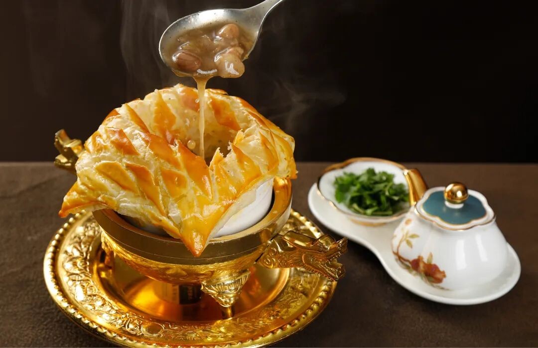 在河南傳統(tǒng)胡辣湯的基礎(chǔ)上創(chuàng)新的酥皮八珍胡辣湯,選用新鮮羊肉熬湯、上等胡椒,加入海參、鮑魚、廣肚、裙邊等八種珍貴食材,配上蔥油餅制成的酥皮,烤至金黃,中西結(jié)合,呈現(xiàn)獨(dú)特的舌尖風(fēng)味。