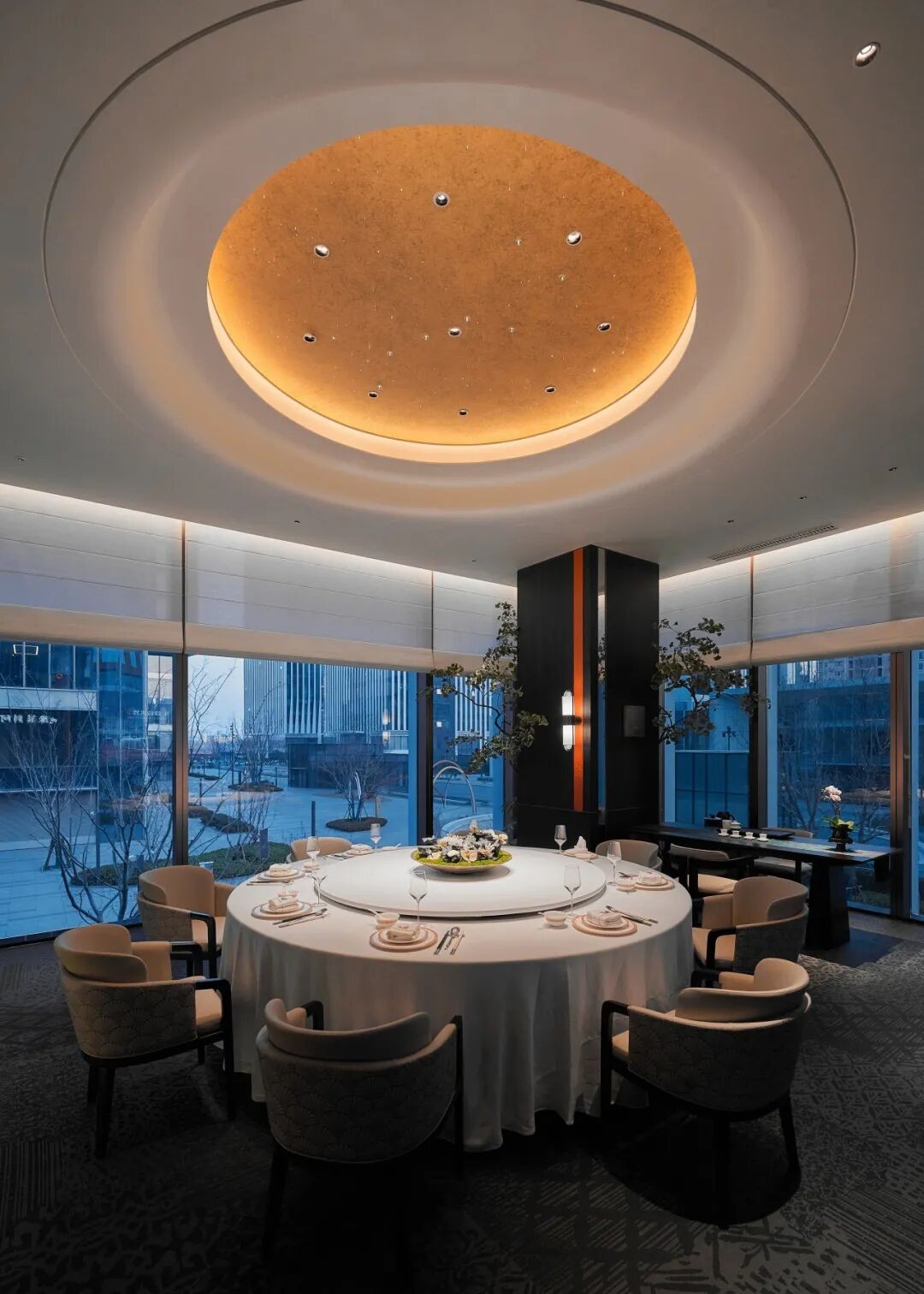 細(xì)節(jié)也都藏著匠心--在商代青銅器“獸面紋”基礎(chǔ)上融入鯉魚躍動姿態(tài)的定制骨瓷餐具;以鼎為器的臺面花藝,厚重古樸中綻放出生機(jī)。