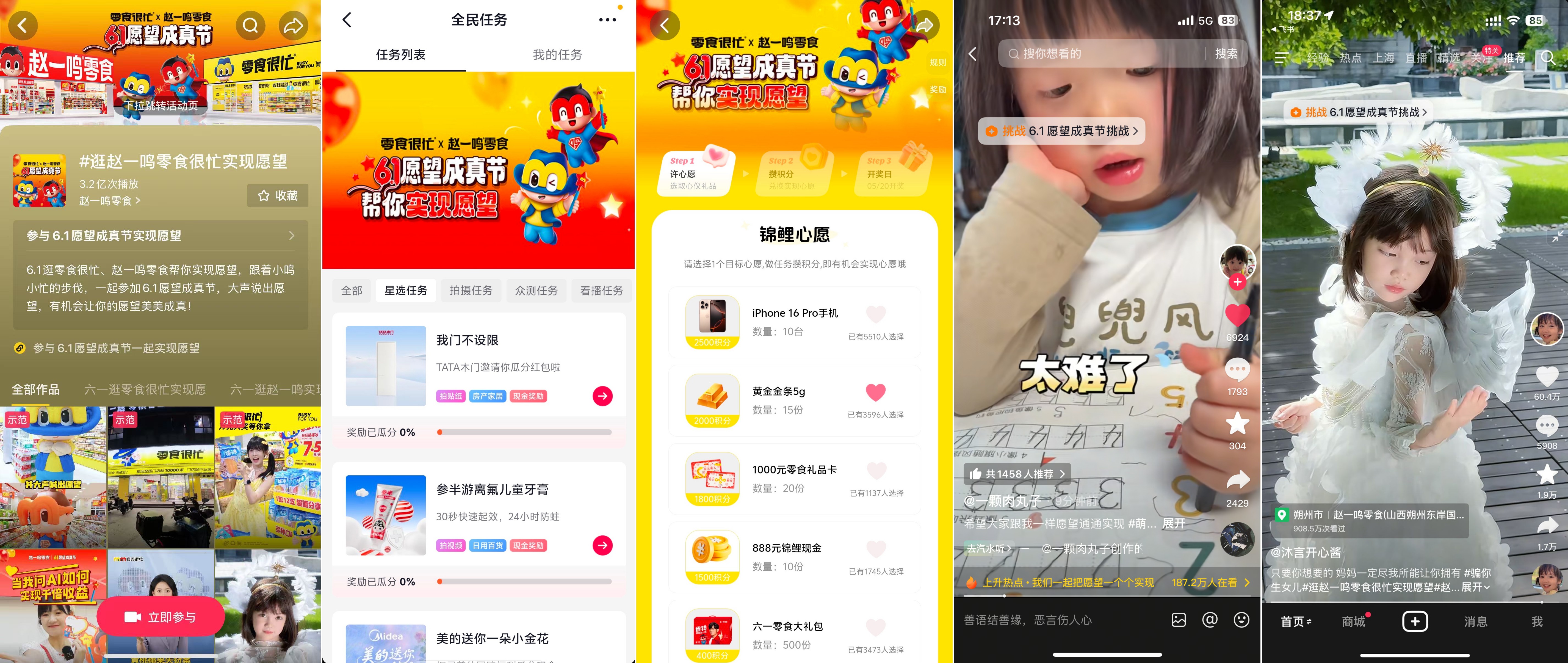 活動前期,鳴鳴很忙集團(零食很忙、趙一鳴)便展開了立體化攻勢。預(yù)熱期邀請10位站內(nèi)高人氣星圖達人化身“愿望體驗官”,通過創(chuàng)意形式示范“心愿禮”玩法并點燃全民許愿熱情:用戶進入活動頁,可從“懷舊零食自由”“IP限量禮盒”“全家出游基金”等定制化心愿池中選擇目標,通過完成每日簡單任務(wù)即可積累“童心積分”,積分可兌換抽獎機會或直接解鎖階梯式心愿獎勵。 另外,品牌以“心愿禮+挑戰(zhàn)賽”雙模式撬動社交裂變——重磅發(fā)起#逛趙一鳴零食很忙實現(xiàn)愿望 核心話題,結(jié)合抖音“心愿禮”功能與“愿望成真挑戰(zhàn)賽”向全網(wǎng)發(fā)出“61逛鳴鳴很忙,幫你實現(xiàn)愿望”的誠摯邀約。這一玩法將“任務(wù)積分蓄水”與“社交禮贈裂變”深度捆綁,不僅以低門檻、高趣味性調(diào)動用戶參與感,更通過情感化內(nèi)容刷新品牌創(chuàng)新形象,成功搶占活動初始熱度。