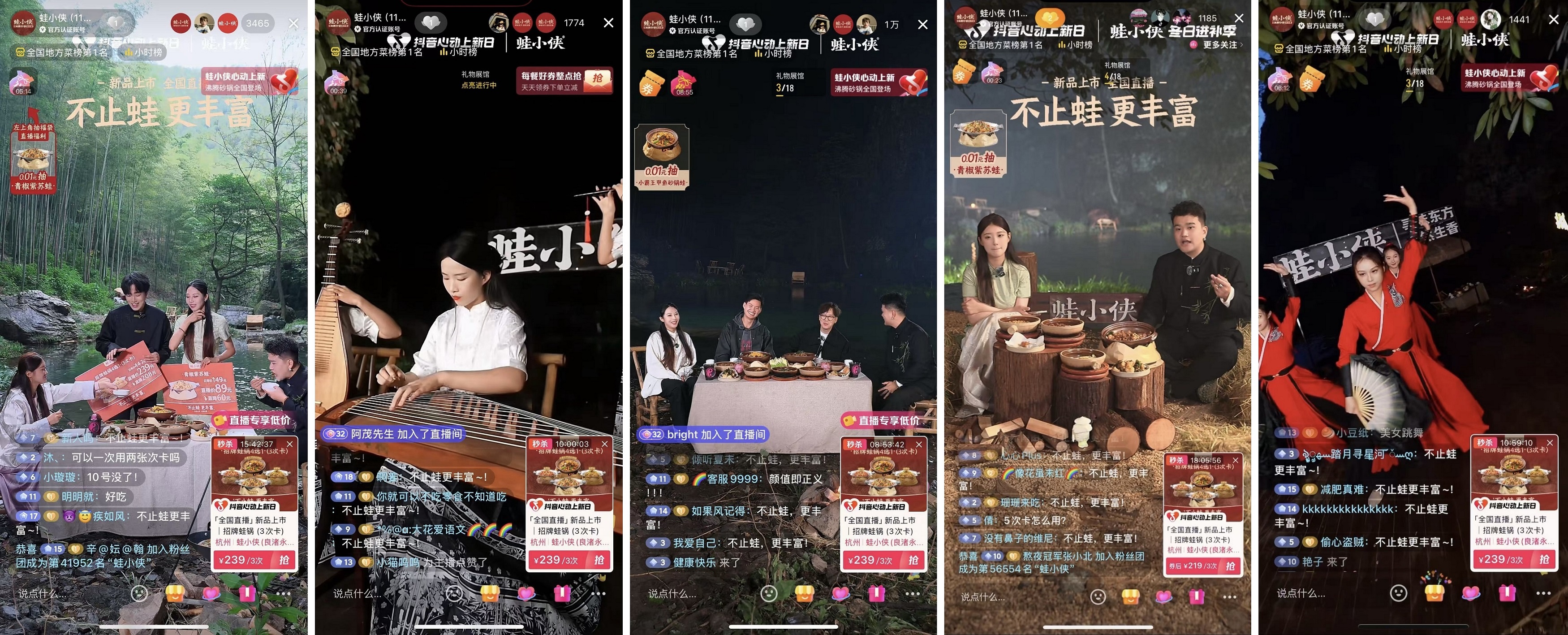 為了讓大家的直播體驗更上一層樓,蛙小俠品牌將場景精心選址于與品牌調(diào)性高度契合的戶外,于有山有水有人氣的風(fēng)景勝地“優(yōu)雅”開播,主打為用戶營造氛圍感拉滿的視覺盛宴。在直播玩法上,蛙小俠更是突破傳統(tǒng)邊界,巧妙融入了非遺文化類與舞蹈類表演,不僅讓大家在蛙小俠門店大飽口福,還能在直播間大飽眼福,而且從側(cè)面彰顯了品牌“堅守文化根基,傳承文化精髓”的理念愿景。此外,品牌還特別邀請了蛙小俠主理人“空降”直播間,以親切自然的對話交流方式,向觀眾詳述了從“鐵鍋蛙”到“沸騰砂鍋”的革新歷程,讓用戶對品牌文化有了具象化認知,增強了品牌的親和力和感染力。